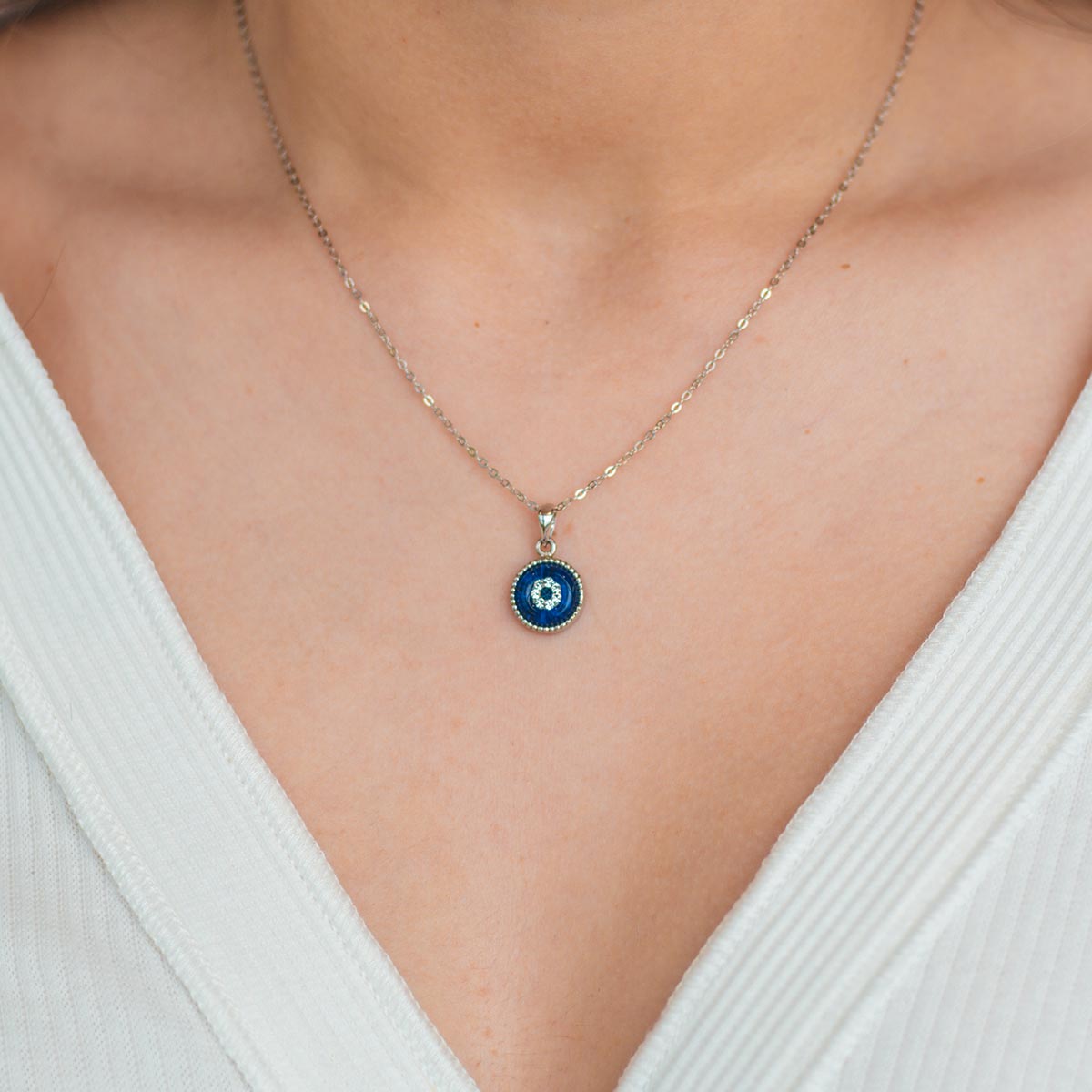 Round Milgrain Blue Crystal Evil Eye Necklace