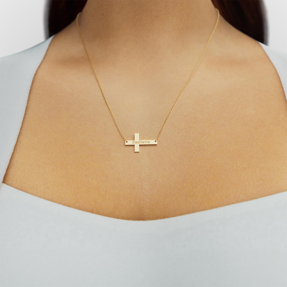 Narrow Horizontal Bar Necklace with Engraving and Cross Charm
