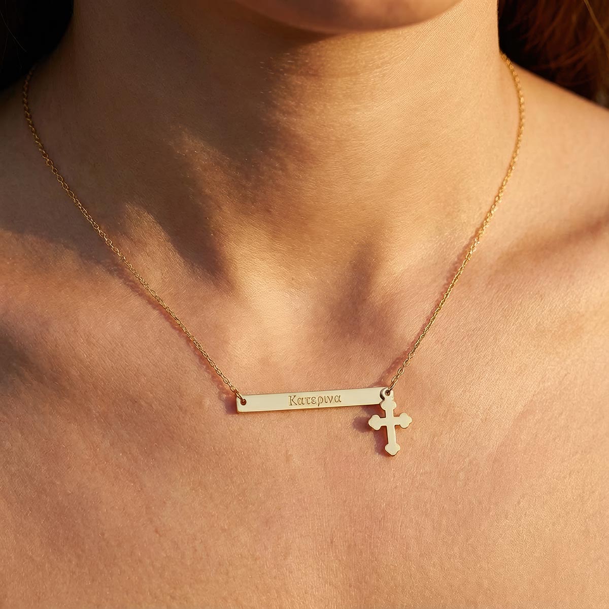 Narrow Horizontal Bar Necklace with Greek Engraving and Cross Charm