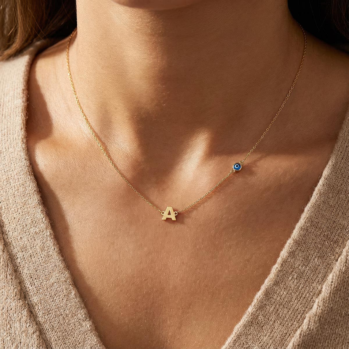 Personalized Initial Necklace With Round Evil Eye Charm
