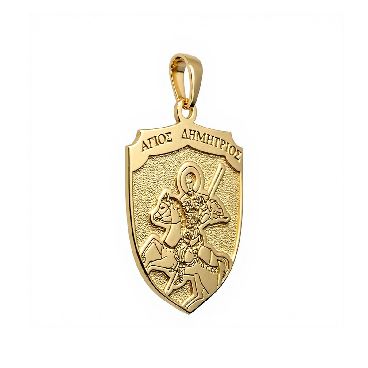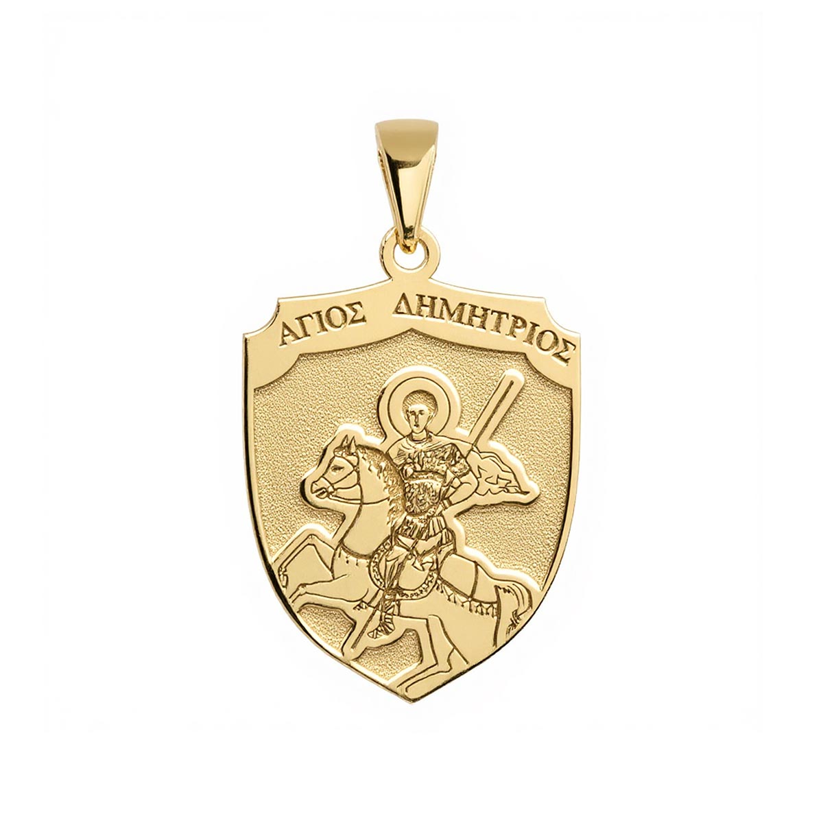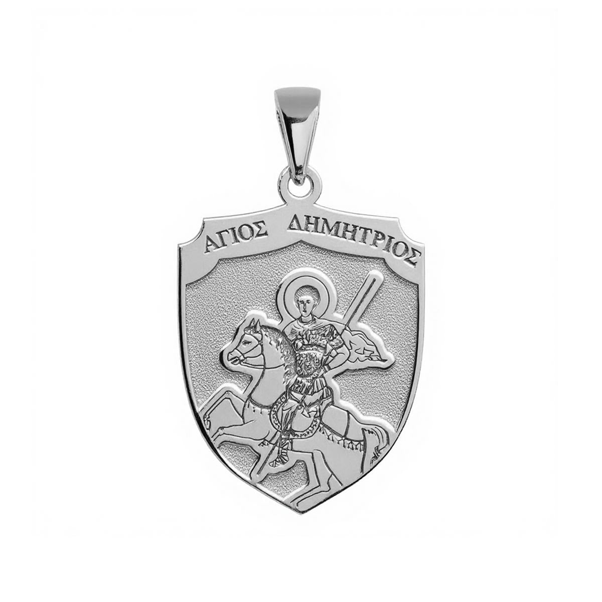 Experience divine protection with our exquisite Saint Demetrius (Demetrios) on Horse Greek Orthodox Icon Shield Medal. This beautifully crafted piece features a stunning depiction of Saint Demetrius, the valiant warrior saint, mounted on horseback. Adorned with intricate detail and imbued with spiritual significance, this medal serves as a powerful amulet. It's perfect for those seeking comfort, courage, and a tangible connection to their faith. Own a piece of sacred art that blends timeless tradition with elegant design.