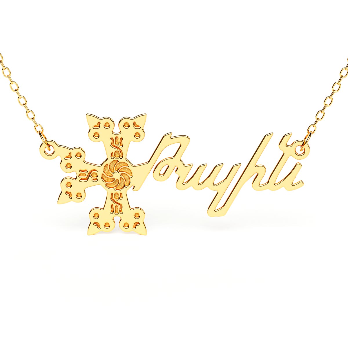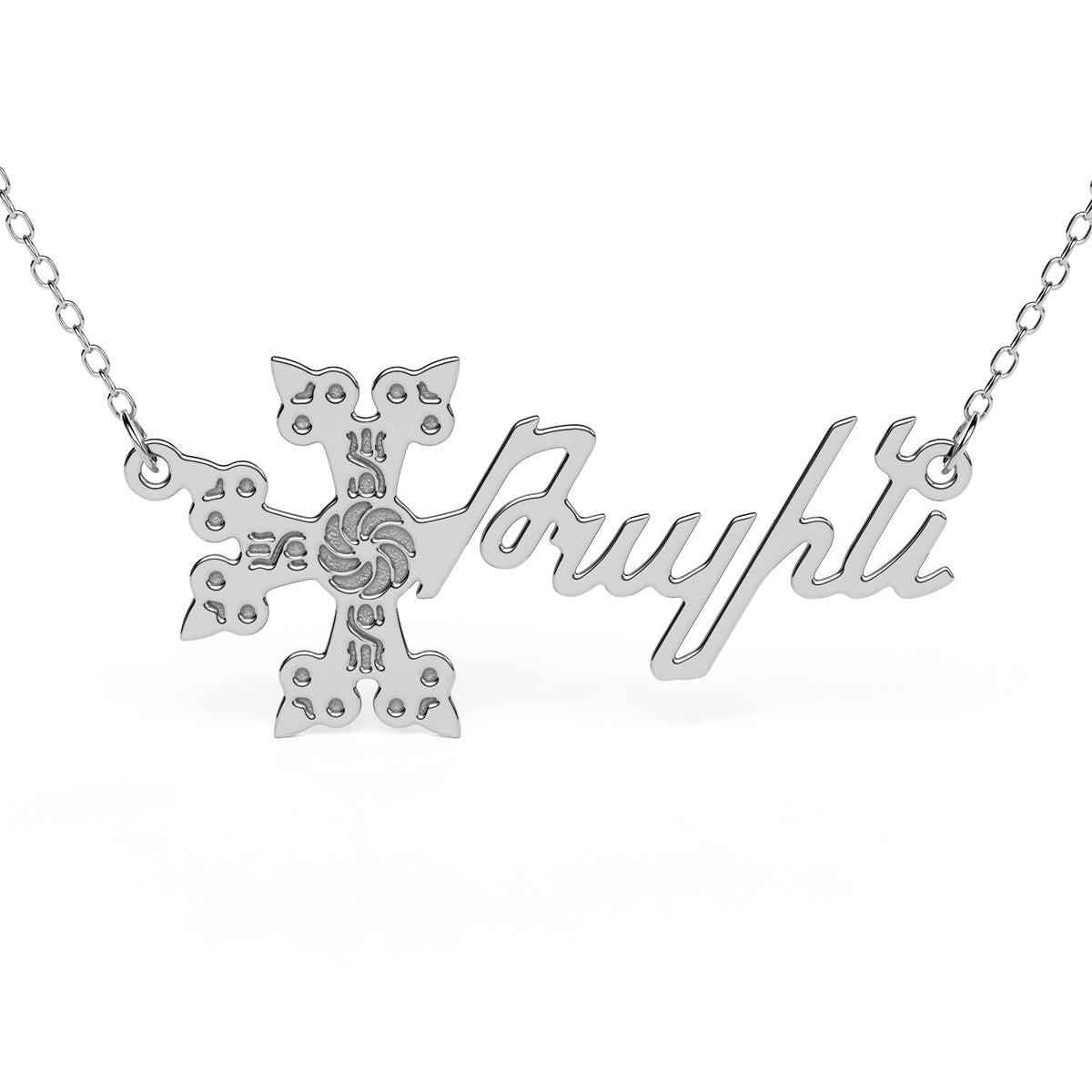 The sideways cross Armenian name necklace is the modern necklace your jewelry box is missing. Featuring an eye-catching pendant that fuses a traditional Armenian cross with the Armenian name or word of your choice, this necklace is guaranteed to add some shine to any outfit.
