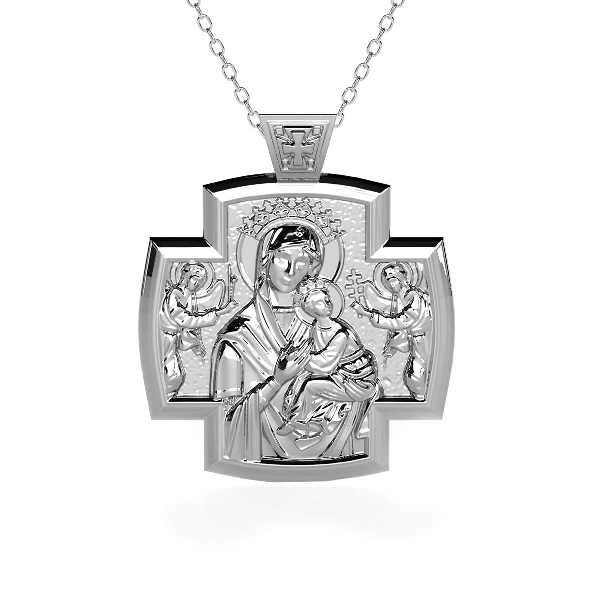 The Virgin Mary & Jesus two-sided cross necklace is thoughtfully designed with multiple images of the Virgin Mary and Baby Jesus. On one side, this cross-shaped pendant features a relief of the Virgin Mary cradling Baby Jesus in her arms, surrounded by saints. On the other side, you'll find another design depicting Jesus Christ. This pendant is available in both standard and mini sizes and would make a meaningful gift.