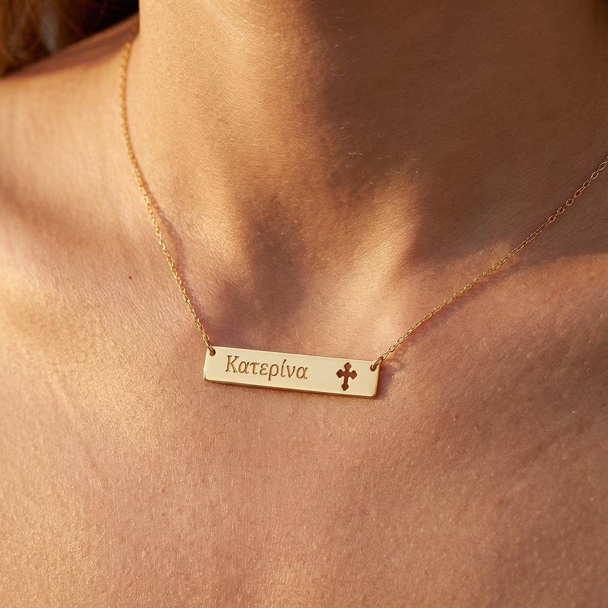 Add a timeless symbol of faith to your Greek name jewelry collection with the cross cutout bar necklace with Greek engraving. This classic design features a simple bar pendant finished with a Greek cross cutout design. Engrave it with the Greek name or word of your choice to create a necklace as one-of-a-kind as you are.