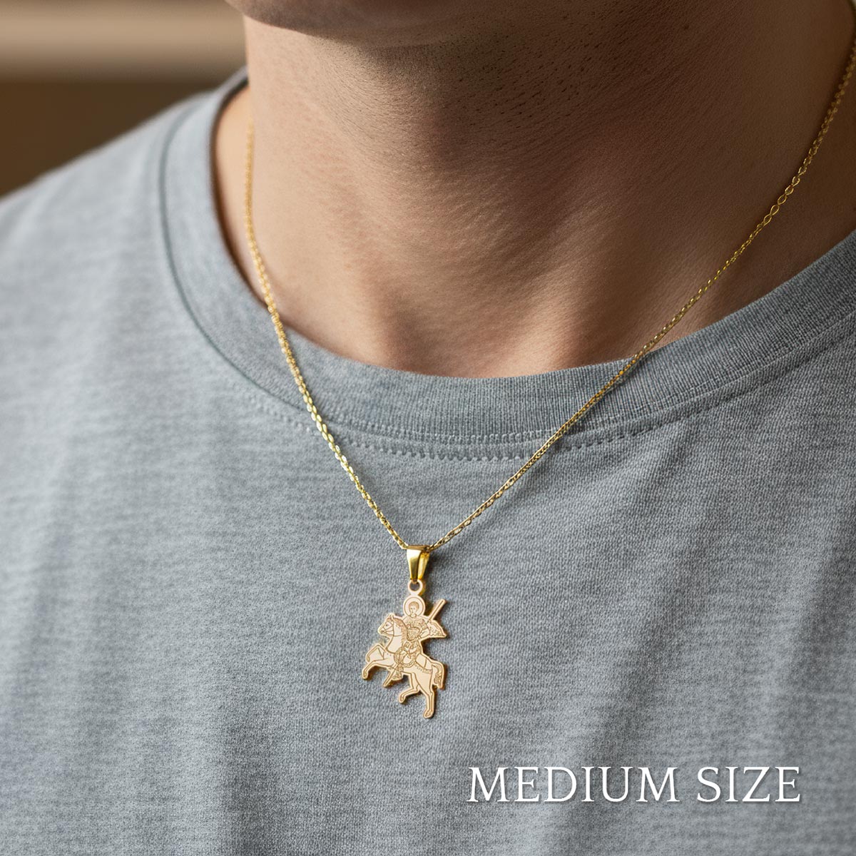 Adorn yourself with the divine protection of the Saint Demetrius (Demetrios) on Horse Greek Orthodox Icon Figure Pendant. Exquisitely crafted, this pendant depicts the revered warrior saint mounted, a symbol of strength and faith. Rendered with authentic Byzantine artistry, its detailed design captures the spiritual essence of this beloved Orthodox icon. This heirloom-quality piece, cast in a rich metal, offers a touch of sacred luxury for your everyday devotion or a meaningful gift for a cherished one. Embrace timeless tradition and spiritual elegance.