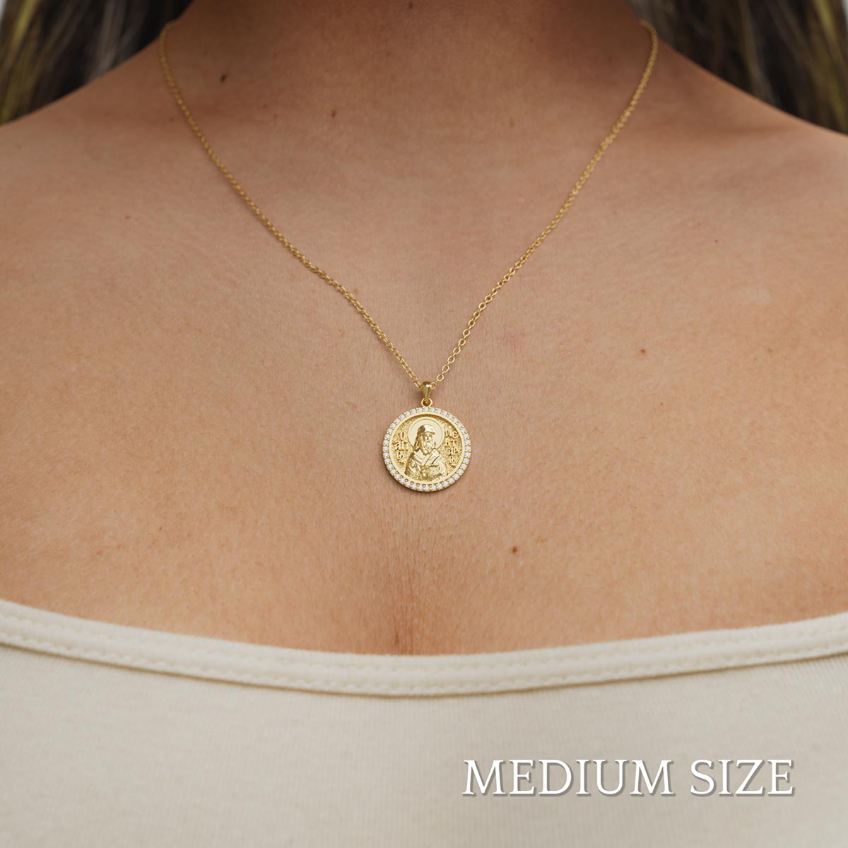 Embrace divine protection with our Saint Nectarios of Aegina Orthodox Icon Sculpted Medium Pavé Round Medal. This exquisite piece features a finely sculpted representation of Saint Nectarios, a beacon of healing and faith. Adorned with a delicate pavé setting, its radiant sparkle complements the intricate detail of the icon. Crafted with exceptional care, this medium-sized round medal offers a touch of spiritual elegance, perfect for personal devotion or as a cherished gift. Let the grace of Saint Nectarios inspire your journey.