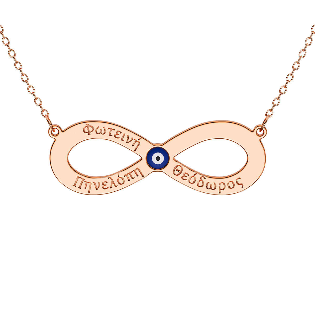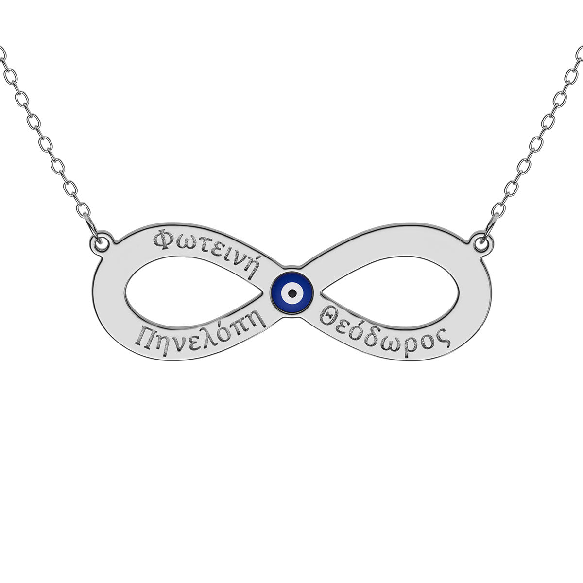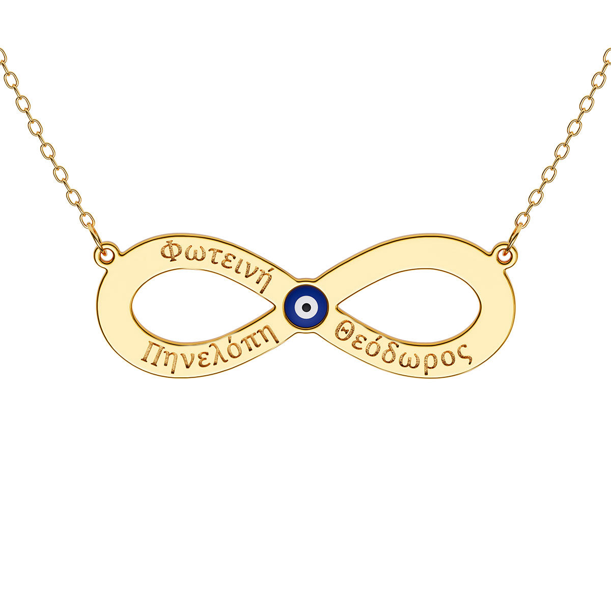 3 Greek Name Engraved Infinity Necklace With Evil Eye