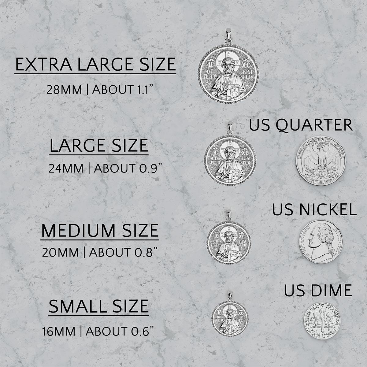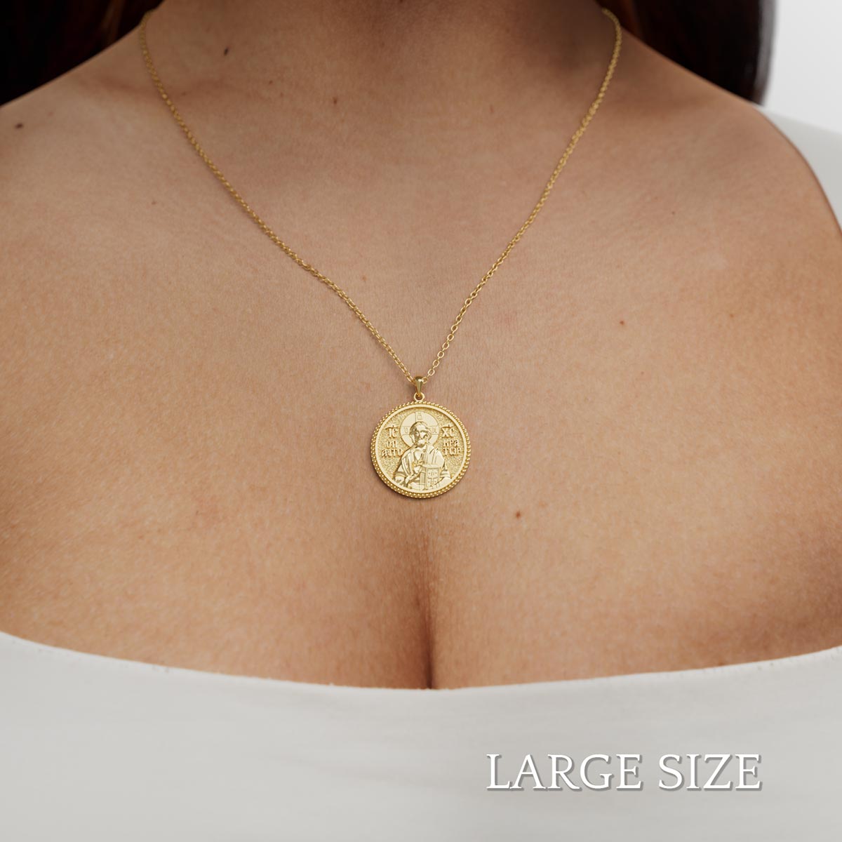 Introducing our divine Christ Pantocrator Sculpted Round Medal, a symbol of divine authority and guidance. This exquisite medal showcases a detailed sculpture of Christ Pantocrator, surrounded by a textured background that adds depth to the design. The letters symbolizing "Christ Pantocrator" further enhance the religious significance of this piece. Meticulously crafted in your choice of solid gold or sterling silver, this round medal is a cherished symbol of faith and divine presence.