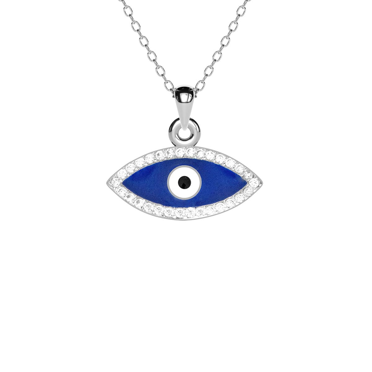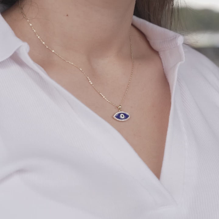 This evil eye necklace is the ultimate statement piece. The marquise eye shape features multiple layers of enamel surrounded by sparkling diamonds, and is a sure way to stand out from the crowd!