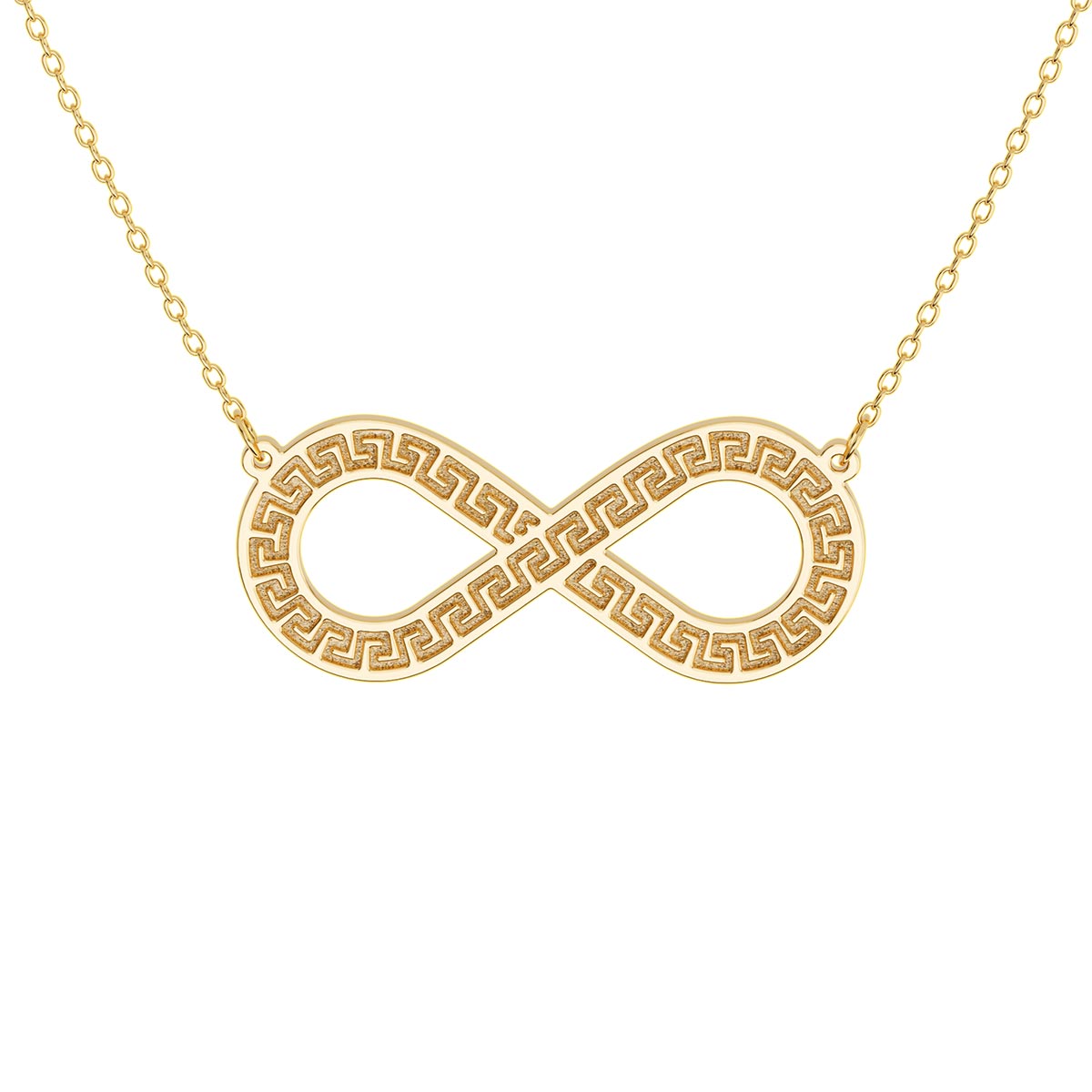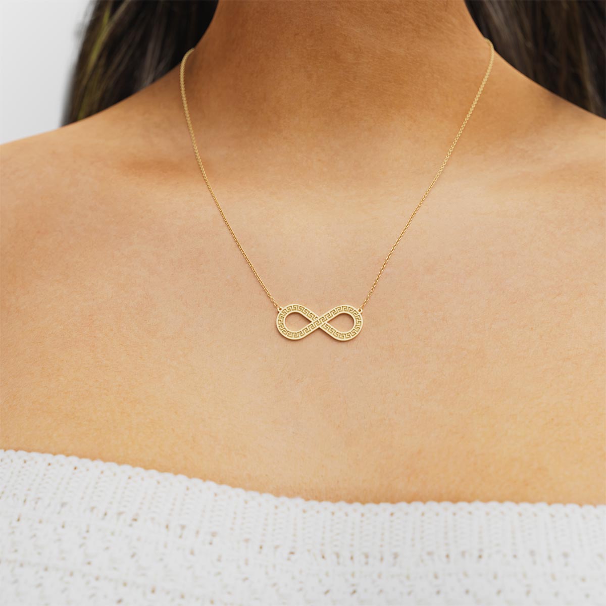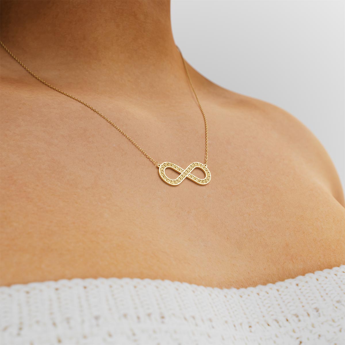 Symbolizing endless possibilities, this infinity necklace adorned with a Greek key pattern represents unending potential. Choose this piece in solid gold or sterling silver to carry a symbol of infinity with elegance and style.