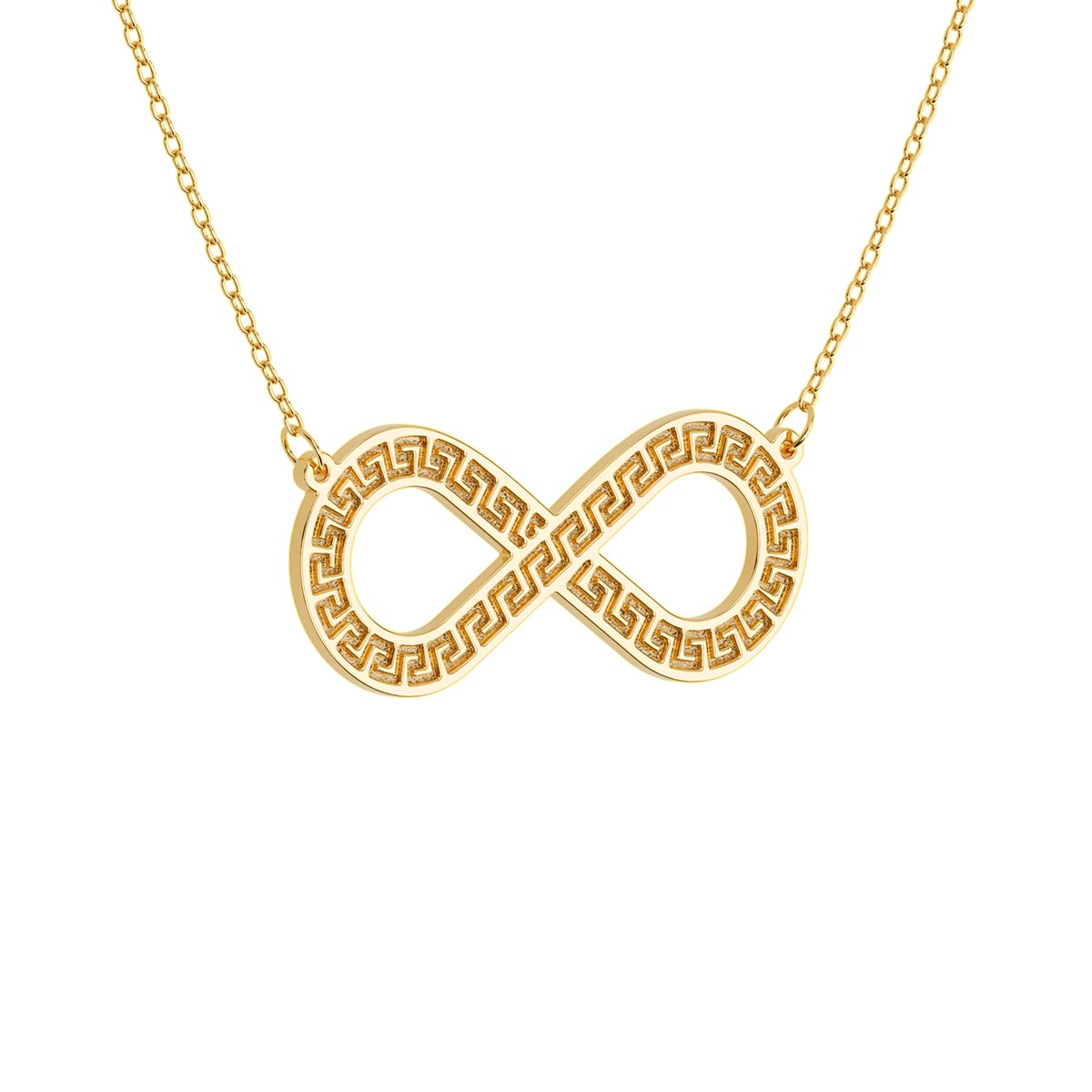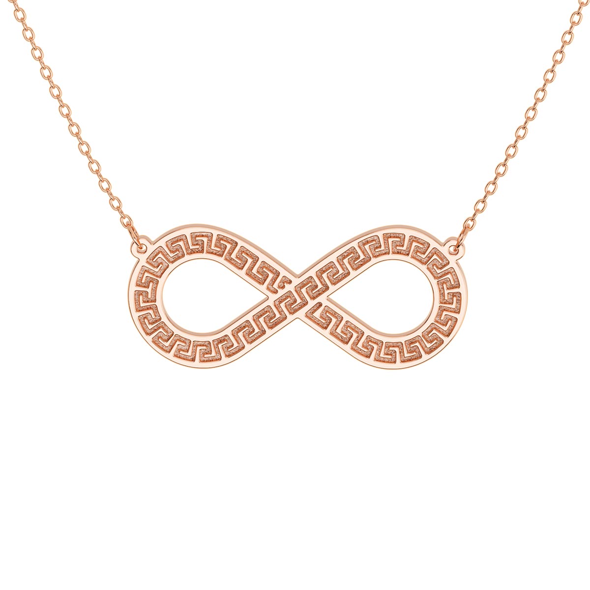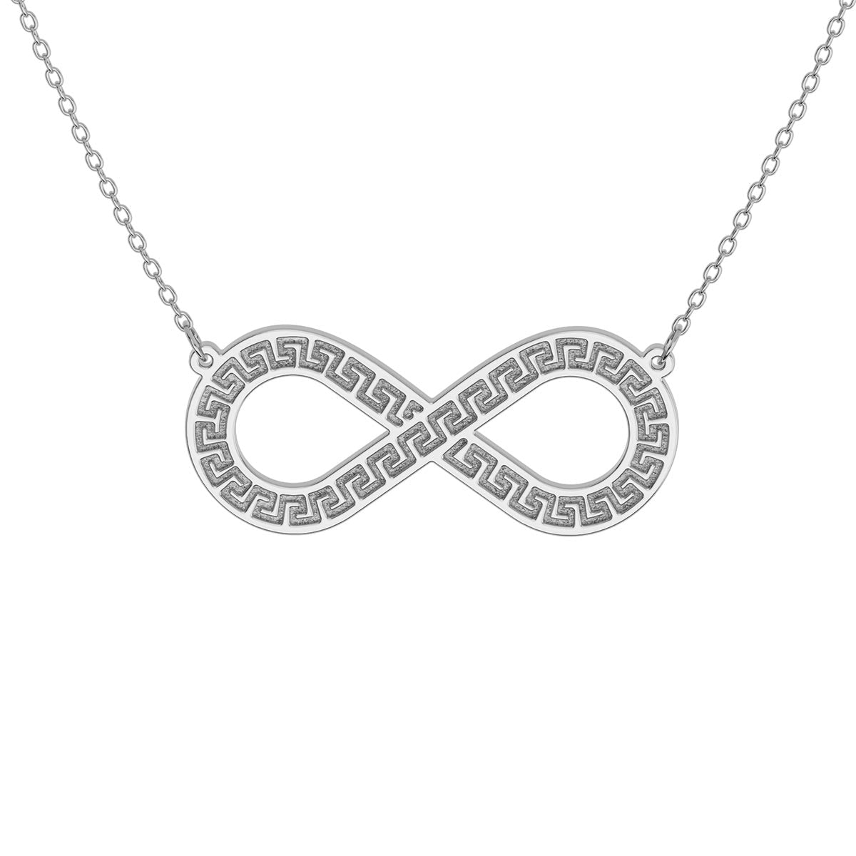 Symbolizing endless possibilities, this infinity necklace adorned with a Greek key pattern represents unending potential. Choose this piece in solid gold or sterling silver to carry a symbol of infinity with elegance and style.