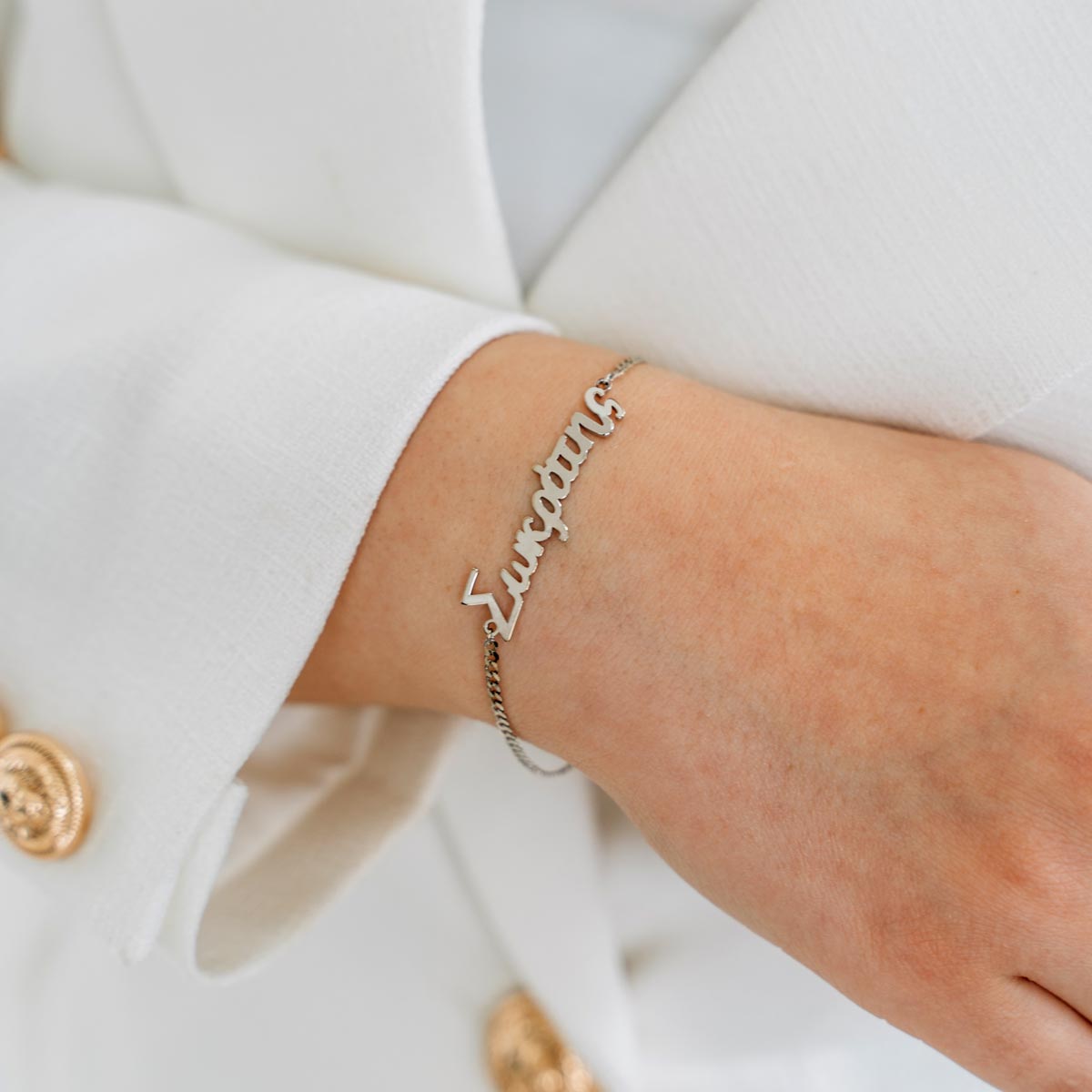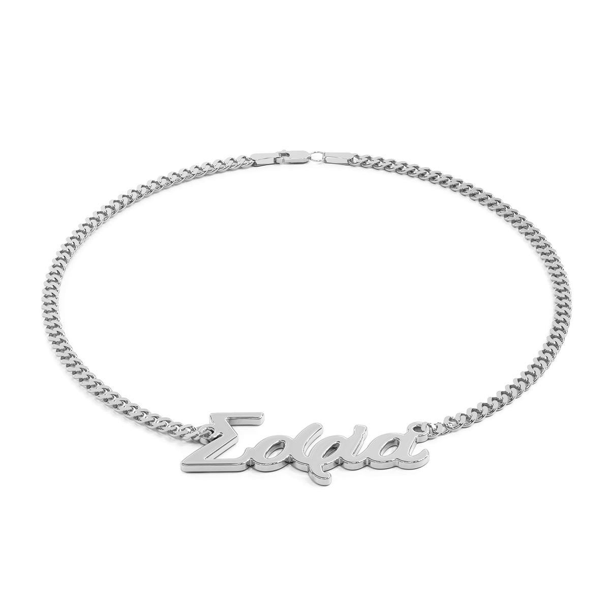 The Greek name bracelet with curb chain is an on-trend way to show off your Greek pride. Featuring bold Greek lettering set on a delicate curb chain, this bracelet can be customized with your Greek name or favorite Greek word to create a piece you'll keep forever.