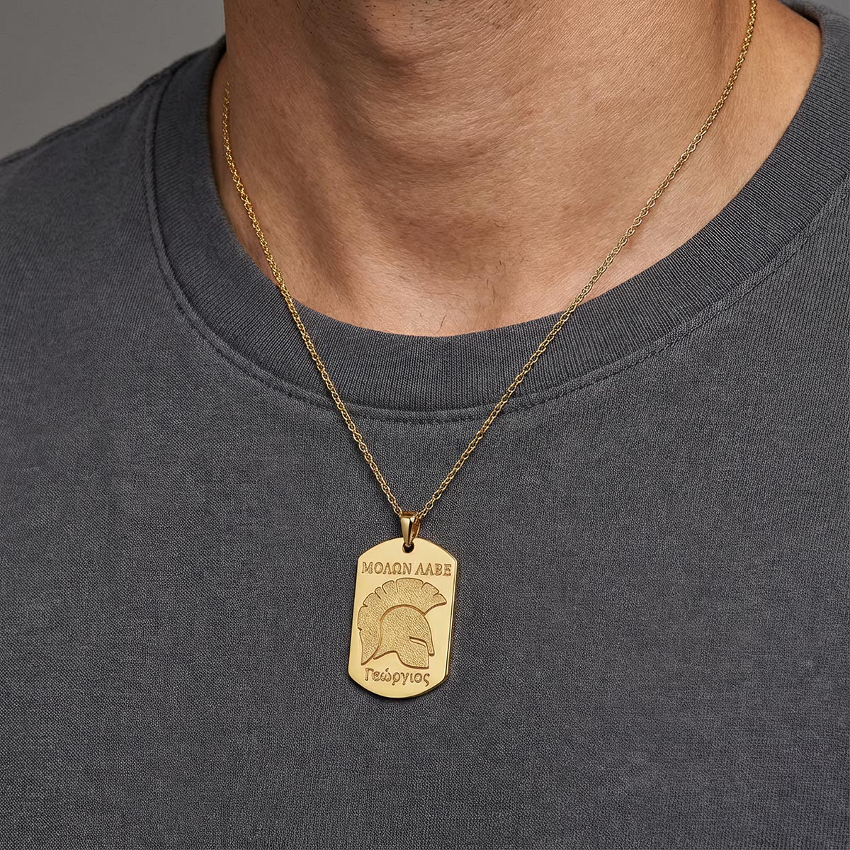 Make a statement with our Personalized Men's Spartan Dog Tag Necklace. The classic design features a Spartan helmet, with your Greek name engraved in a dog tag. The top of the pendant is engraved with the words “Molon Labe”, meaning “come and take them”: a classical expression of rebellion. Show off your Greek pride and let your personality shine with this one-of-a-kind piece.