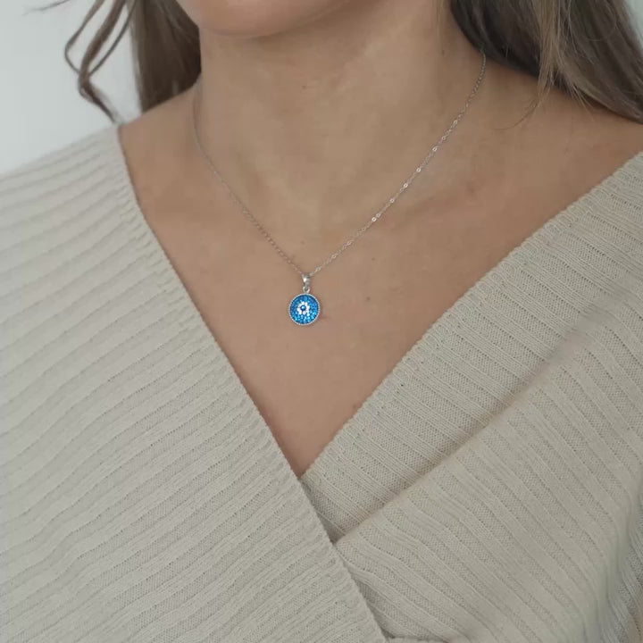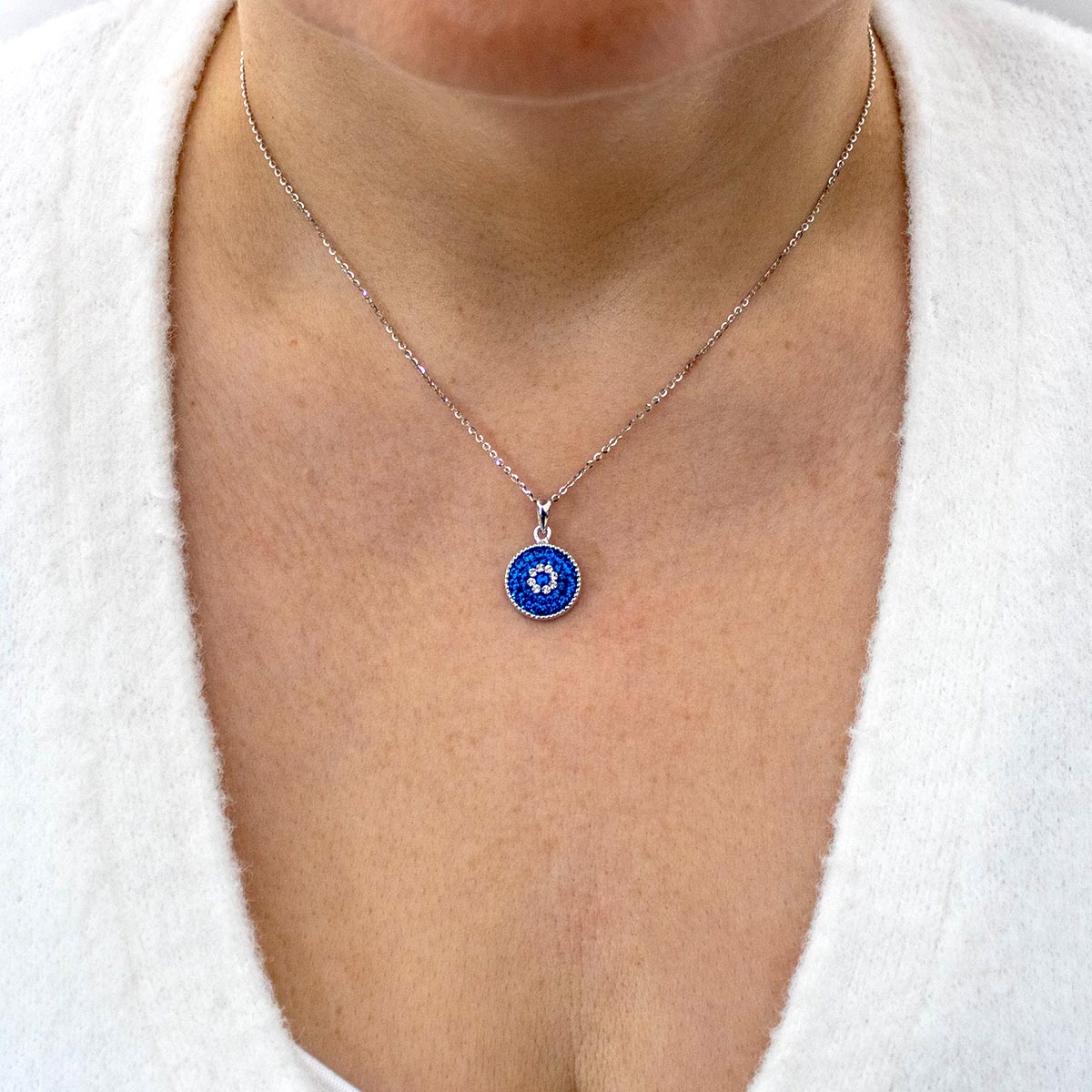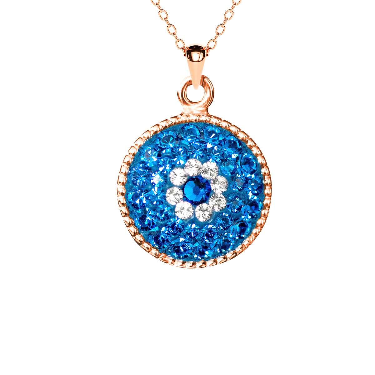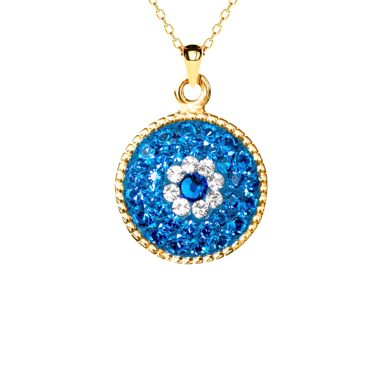 This evil eye necklace is the perfect addition to your collection. Featuring multiple layers of SWAROVSKI crystals, surrounded by a delicate milgrain pattern to complete the look!