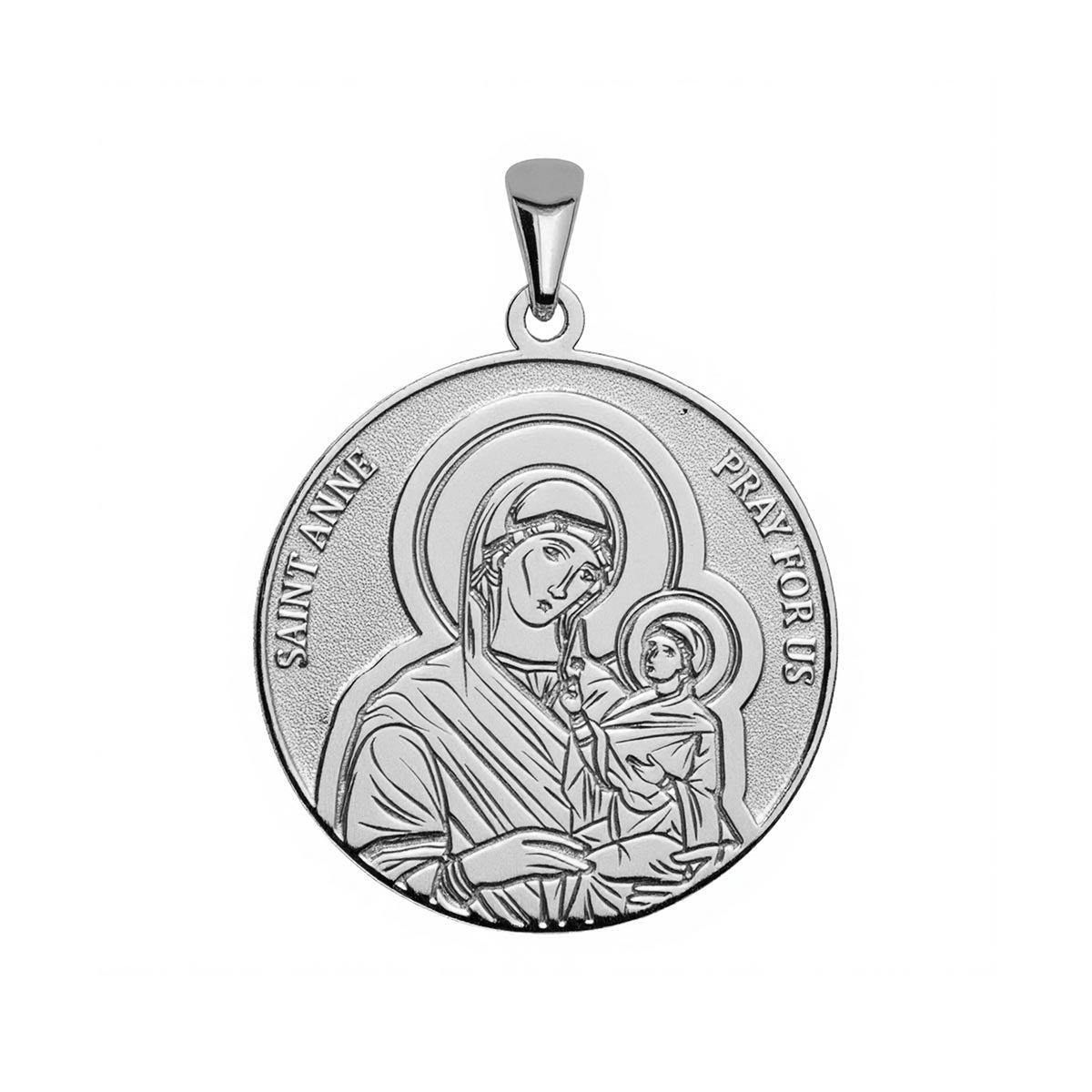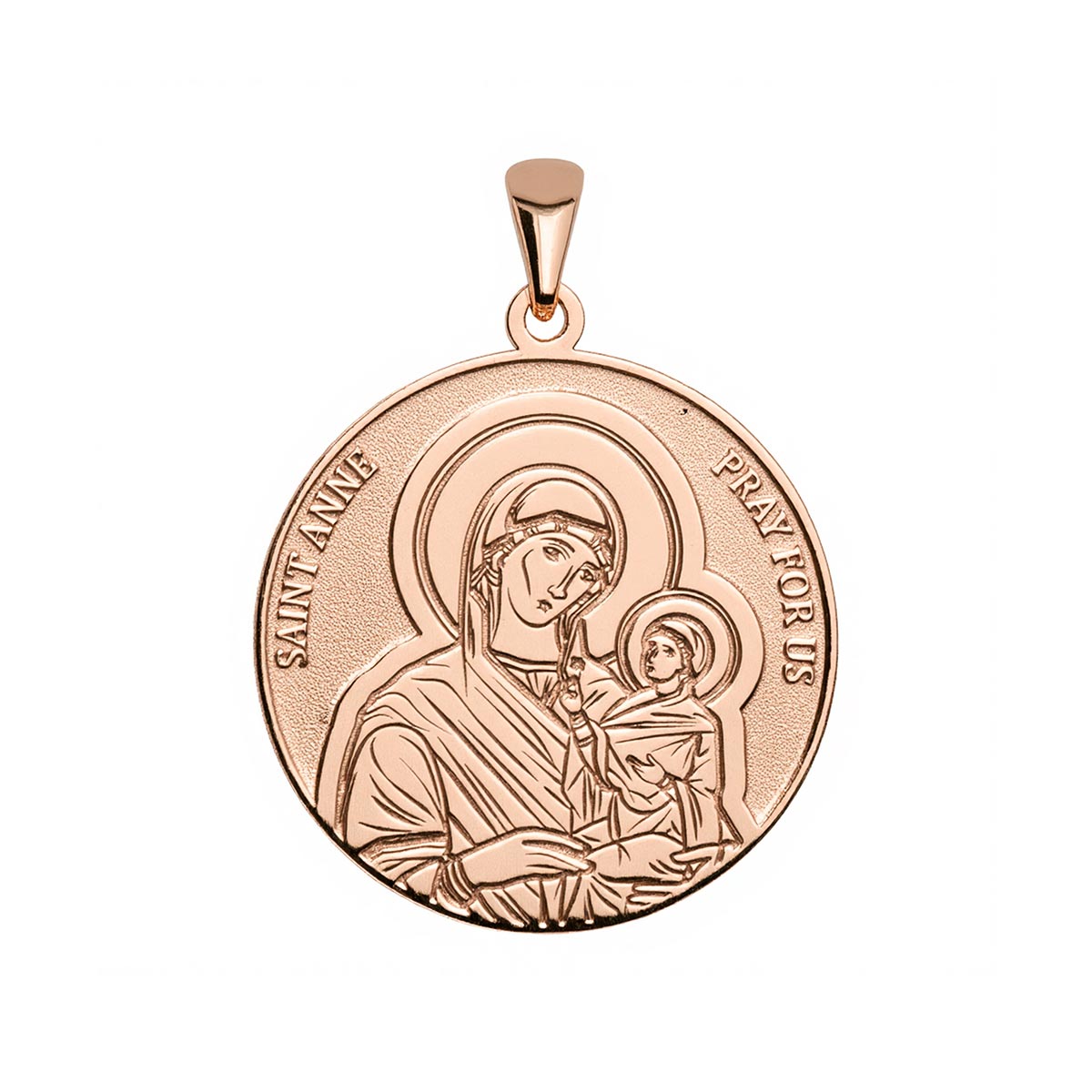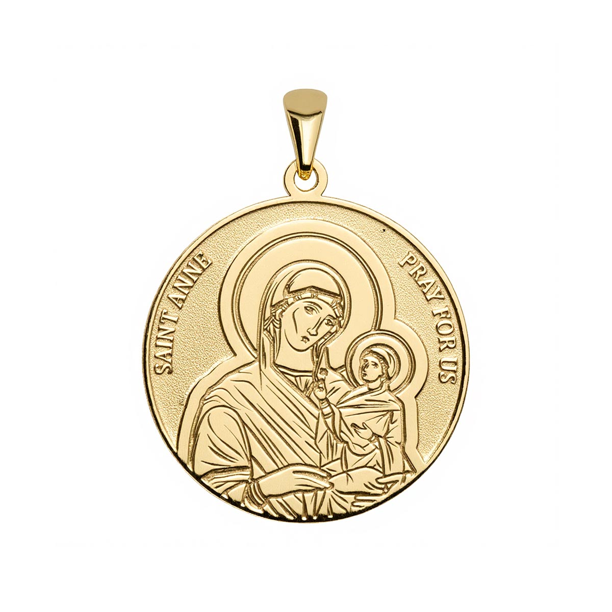 The Saint Anne Round Religious Medal is a remarkable piece of jewelry available in solid gold or sterling silver. It features the image of Saint Anne, the patroness of mothers and grandmothers, with the words "Saint Anne Pray For Us" delicately carved into a round medal. This religious medal is perfect for mothers and grandmothers, carrying a symbol of love, guidance, and family. With its intricate details and impeccable finishing, this medal is a timeless and inspiring accessory meant to uplift and empower the wearer.