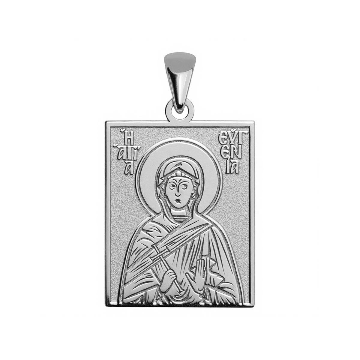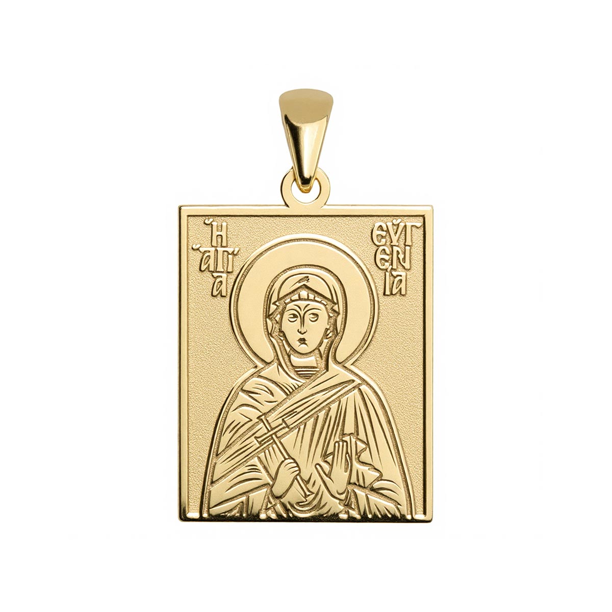 This highly detailed, historically accurate representation of the Greek Orthodox icon of Saint Eugenia of Rome is engraved into a rectangular tag medal in the metal of your choice. Available with or without a chain, this piece makes for the perfect gift for yourself, or for a special someone’s name day! Saint Eugenia was a 3rd-century Christian martyr from Rome. Disguised as a man, she joined a monastery and rose to become the abbot. Eventually, her true gender was discovered, and she was martyred for her faith.