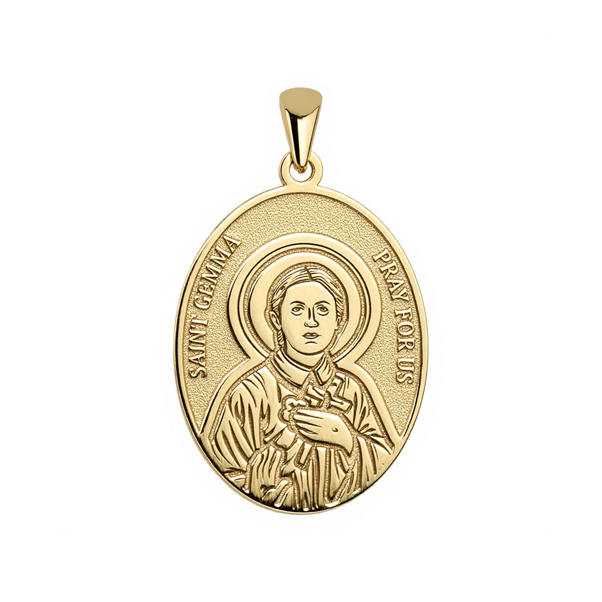 The Saint Gemma Oval Religious Medal is an elegant piece of jewelry available in solid gold or sterling silver. It showcases the image of Saint Gemma, the patroness of pharmacists and those with back pain, with the words "Saint Gemma Pray For Us" elegantly carved into an oval medal. This religious medal is perfect for individuals dealing with physical discomfort, carrying a symbol of faith and hope. With its intricate details and flawless finishing, this medal is a timeless and inspiring accessory meant to uplift and empower the wearer.