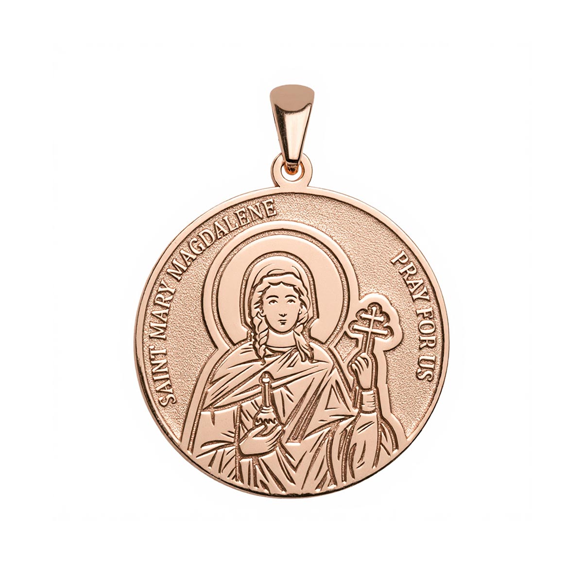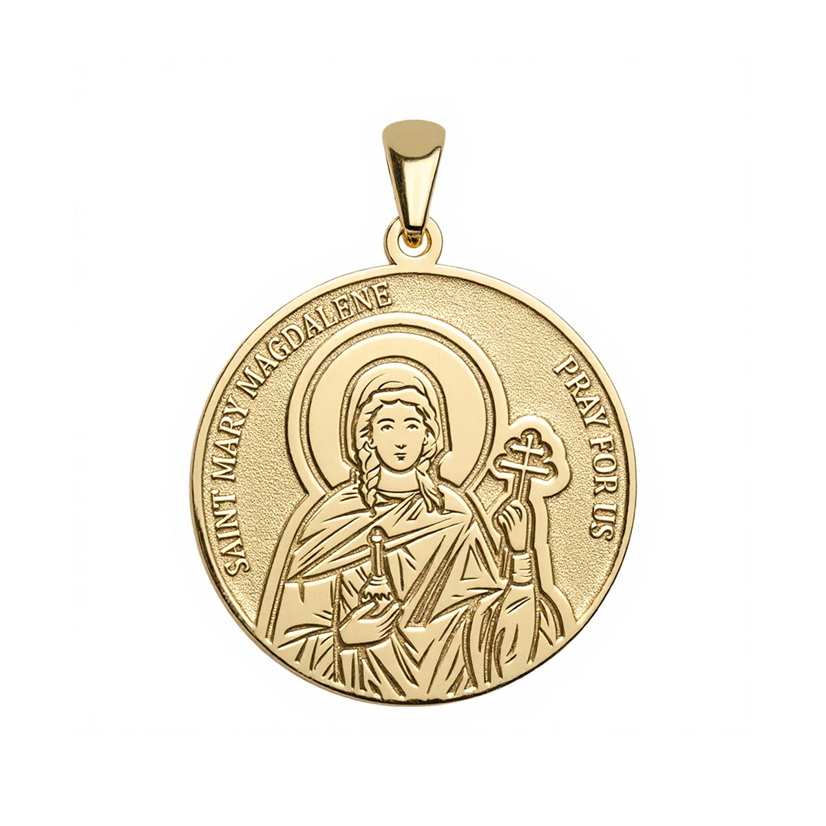 The Saint Mary Magdalene Round Religious Medal is a radiant piece of jewelry available in solid gold or sterling silver. It features the image of Saint Mary Magdalene, the penitent sinner and follower of Jesus, with the words "Saint Mary Magdalene Pray For Us" delicately carved into a round medal. This religious medal is perfect for those seeking redemption and carrying a symbol of faith and transformation. With its intricate details and impeccable finishing, this medal is a timeless and inspiring accessory meant to uplift and empower the wearer.