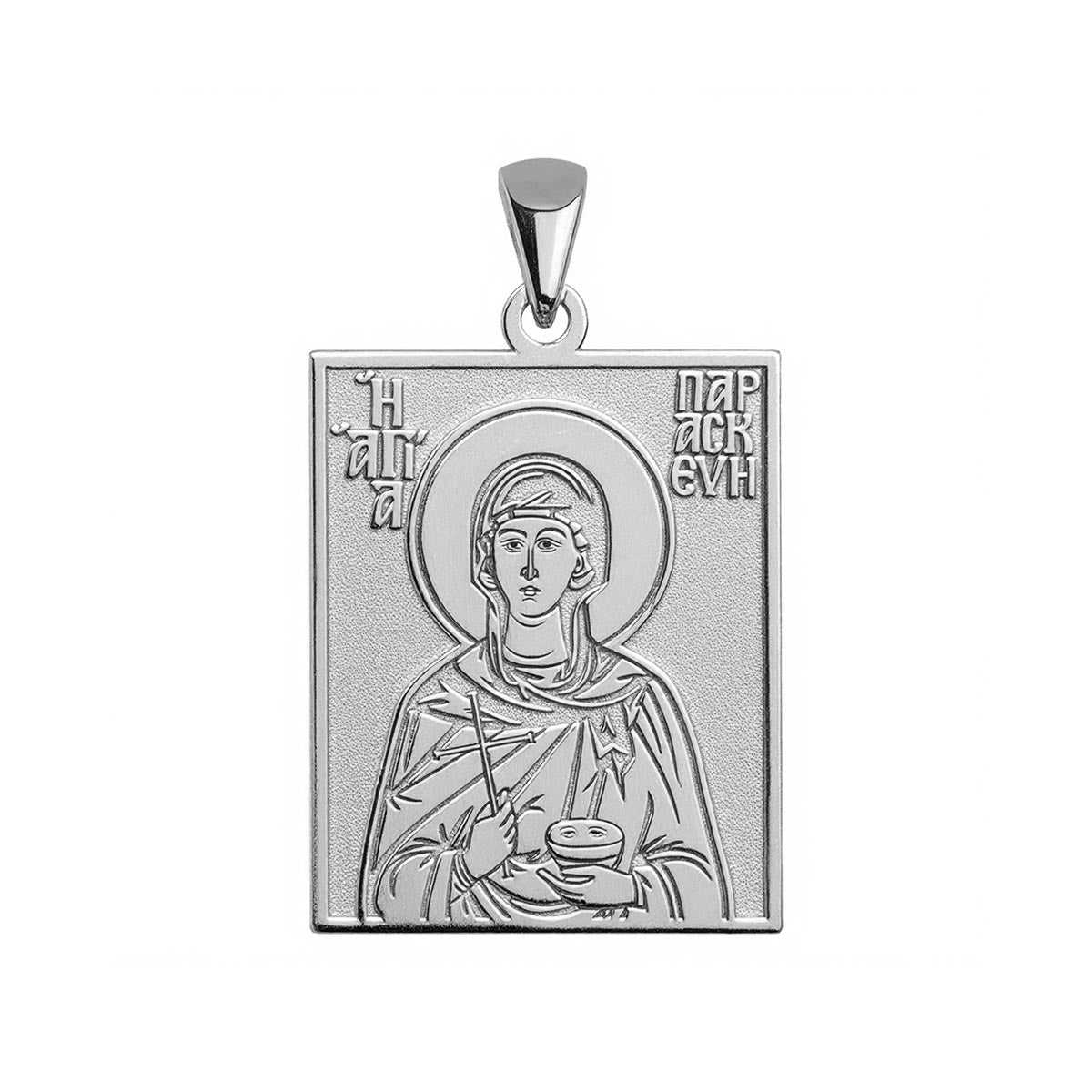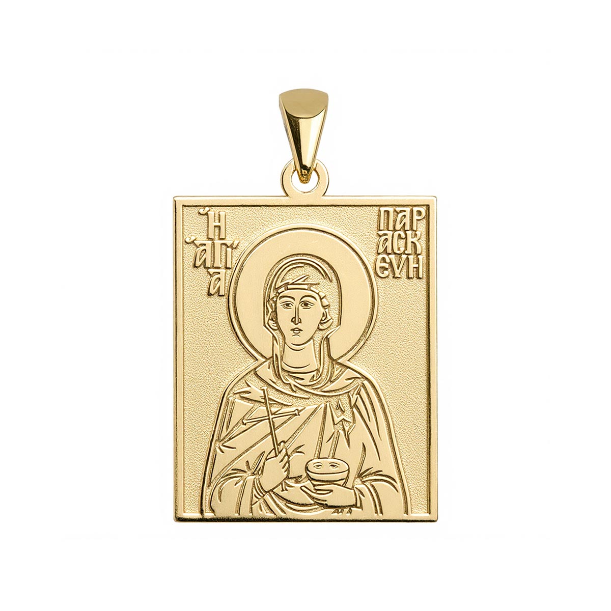 This highly detailed, historically accurate representation of the Greek Orthodox icon of Saint Paraskevi of Rome is engraved into a rectangular tag medal in the metal of your choice. Available with or without a chain, this piece makes for the perfect gift for yourself, or for a special someone’s name day! Saint Paraskevi of Rome was a Christian martyr during the reign of Emperor Antoninus Pius. Her name means "Friday" in Greek, and she is venerated for her chastity and miracles, particularly the healing of eye ailments.