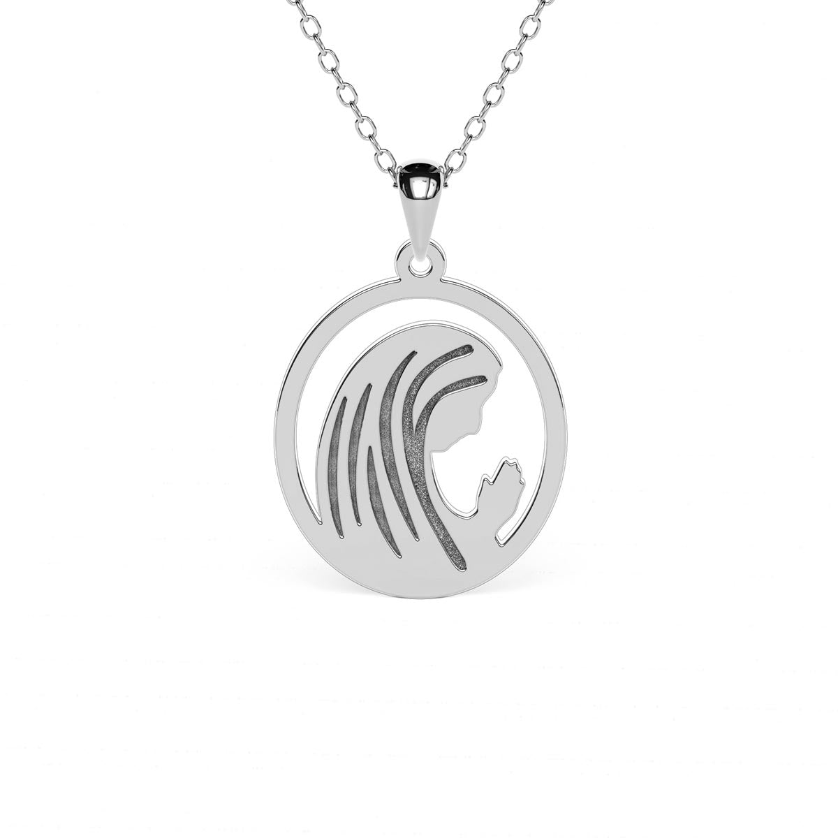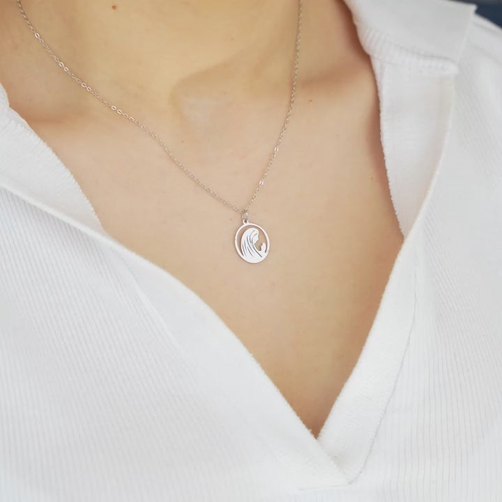 Keep the Virgin Mary with you at all times with the Virgin Mary silhouette necklace. The simple, flat construction of this necklace adds a modern touch to a classic design, which features a silhouette of the Virgin Mary with her hands raised in prayer.
