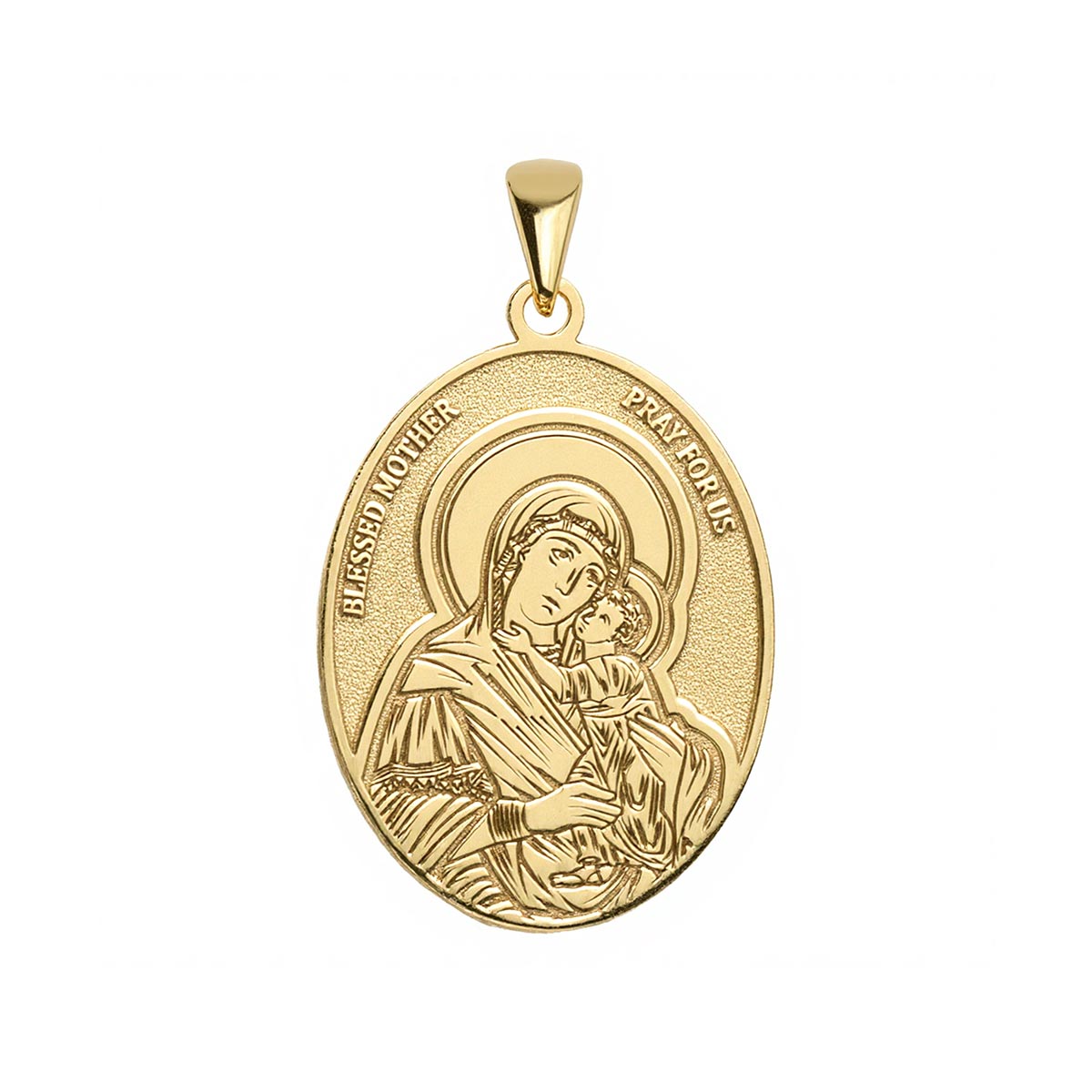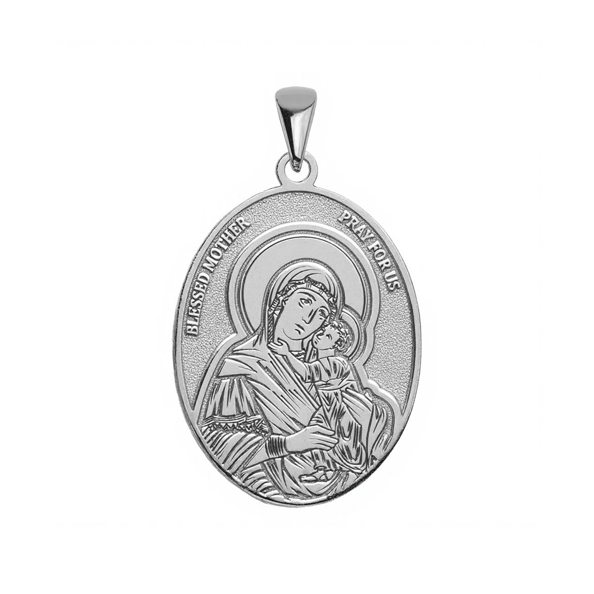 The Blessed Mother Oval Religious Medal is an elegant piece of jewelry available in solid gold or sterling silver. It showcases the image of the Blessed Mother Mary, with the words "Blessed Mother Pray For Us" elegantly carved into an oval medal. This religious medal is perfect for individuals who hold a special place in their heart for the Blessed Mother, carrying a symbol of comfort and divine love. With its intricate details and flawless finishing, this medal is a timeless and inspiring accessory meant to uplift and empower the wearer.