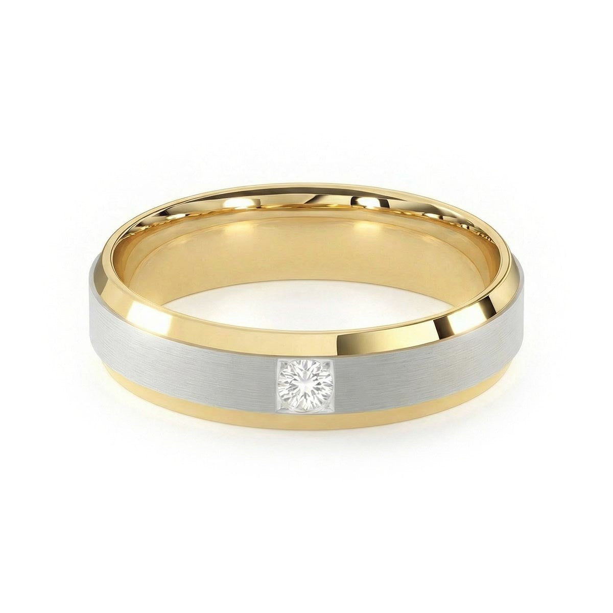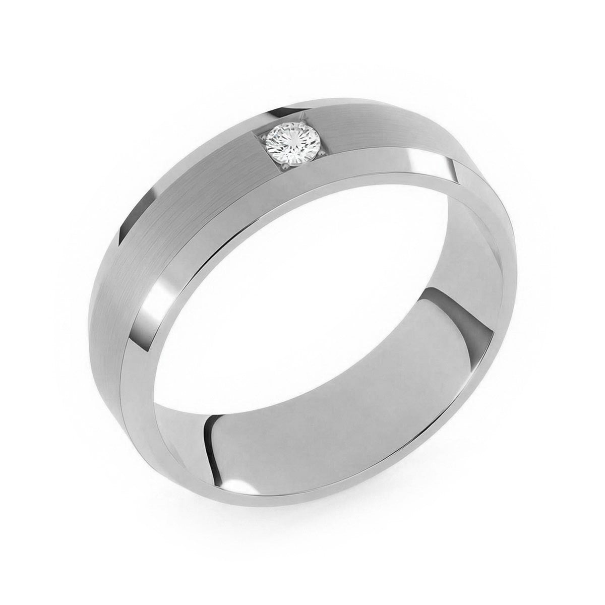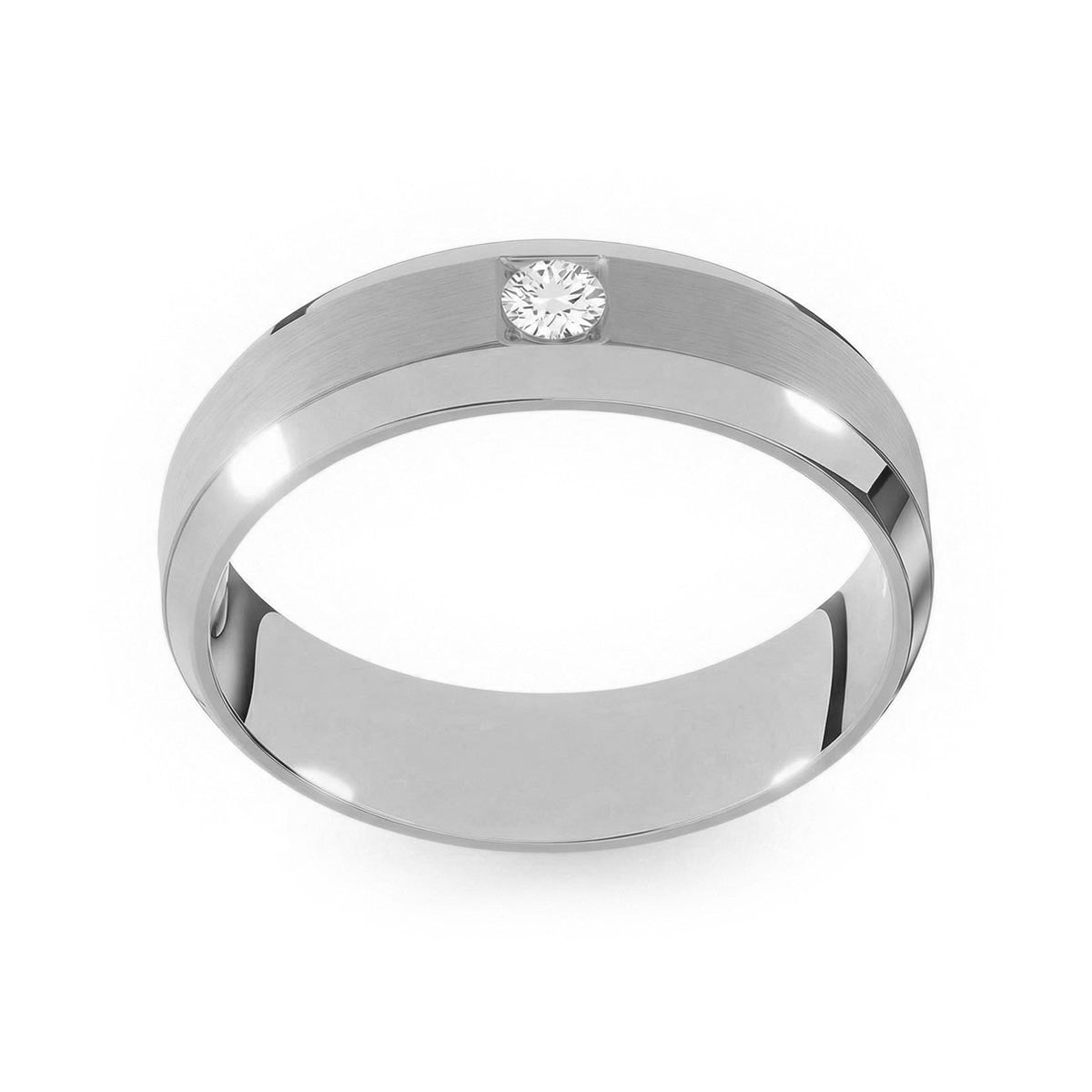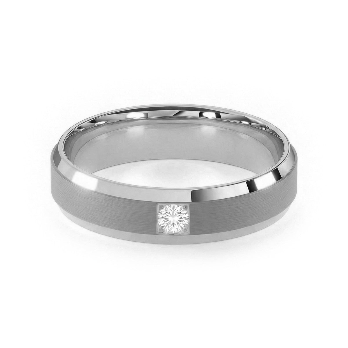 Elevate your commitment with this exquisite 6mm men's wedding ring, a masterpiece of modern luxury. This band features a striking satin inlay center, beautifully framed by polished beveled edges that capture the light from every angle. At its heart sits a brilliant solitaire diamond, offering a touch of refined brilliance. Designed with a premium comfort fit interior, this ring ensures a seamless feel for daily wear. This timeless piece blends masculine strength with sophisticated elegance, making it the perfect symbol of your forever.