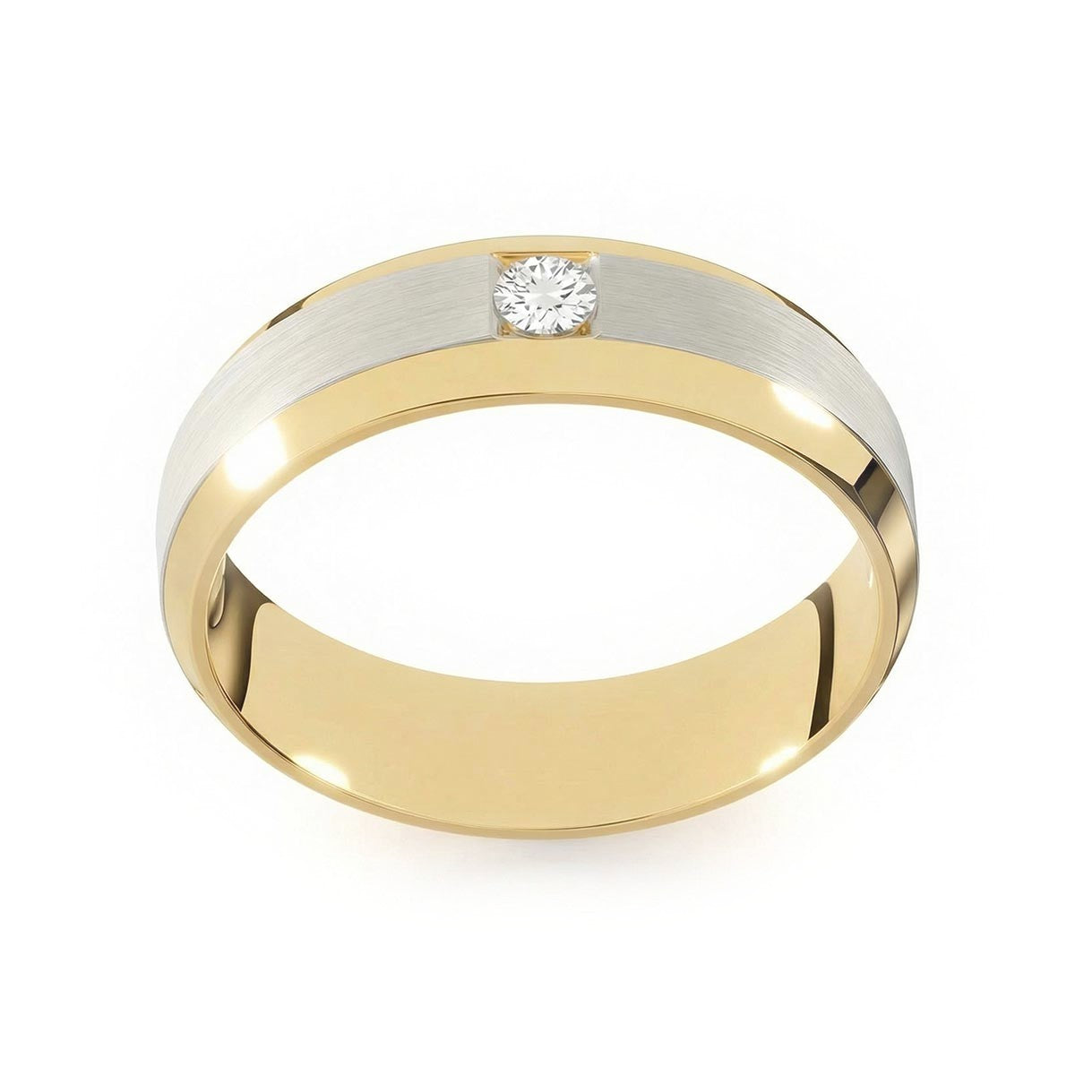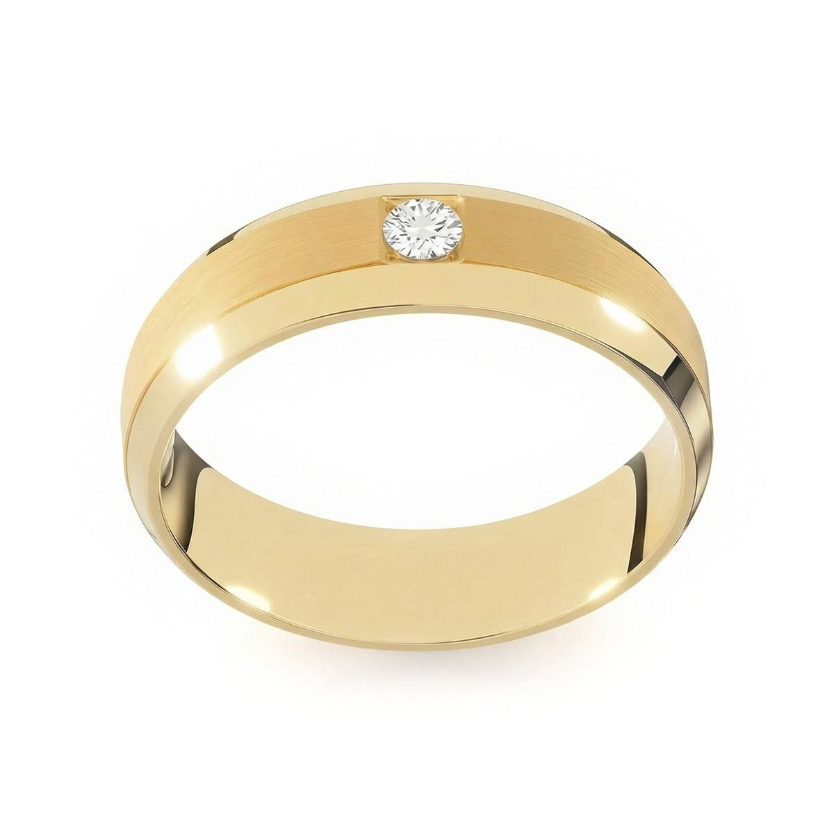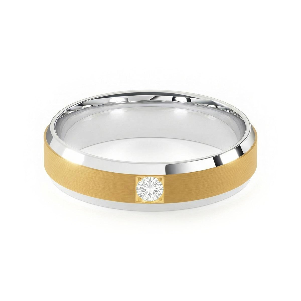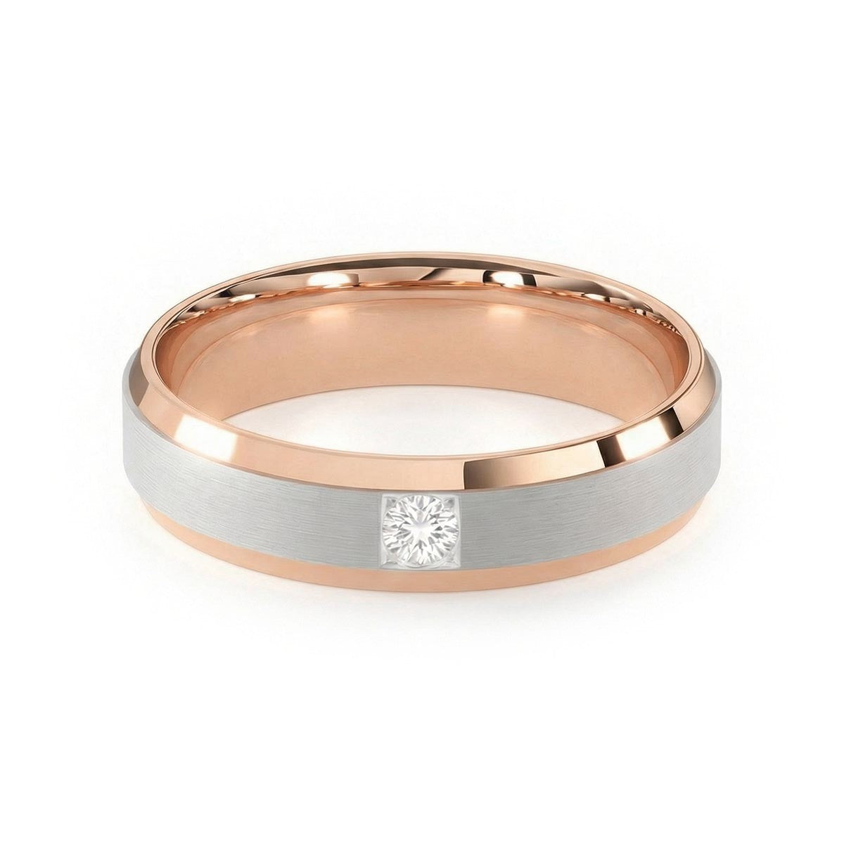 Elevate your commitment with this exquisite 6mm men's wedding ring, a masterpiece of modern luxury. This band features a striking satin inlay center, beautifully framed by polished beveled edges that capture the light from every angle. At its heart sits a brilliant solitaire diamond, offering a touch of refined brilliance. Designed with a premium comfort fit interior, this ring ensures a seamless feel for daily wear. This timeless piece blends masculine strength with sophisticated elegance, making it the perfect symbol of your forever.
