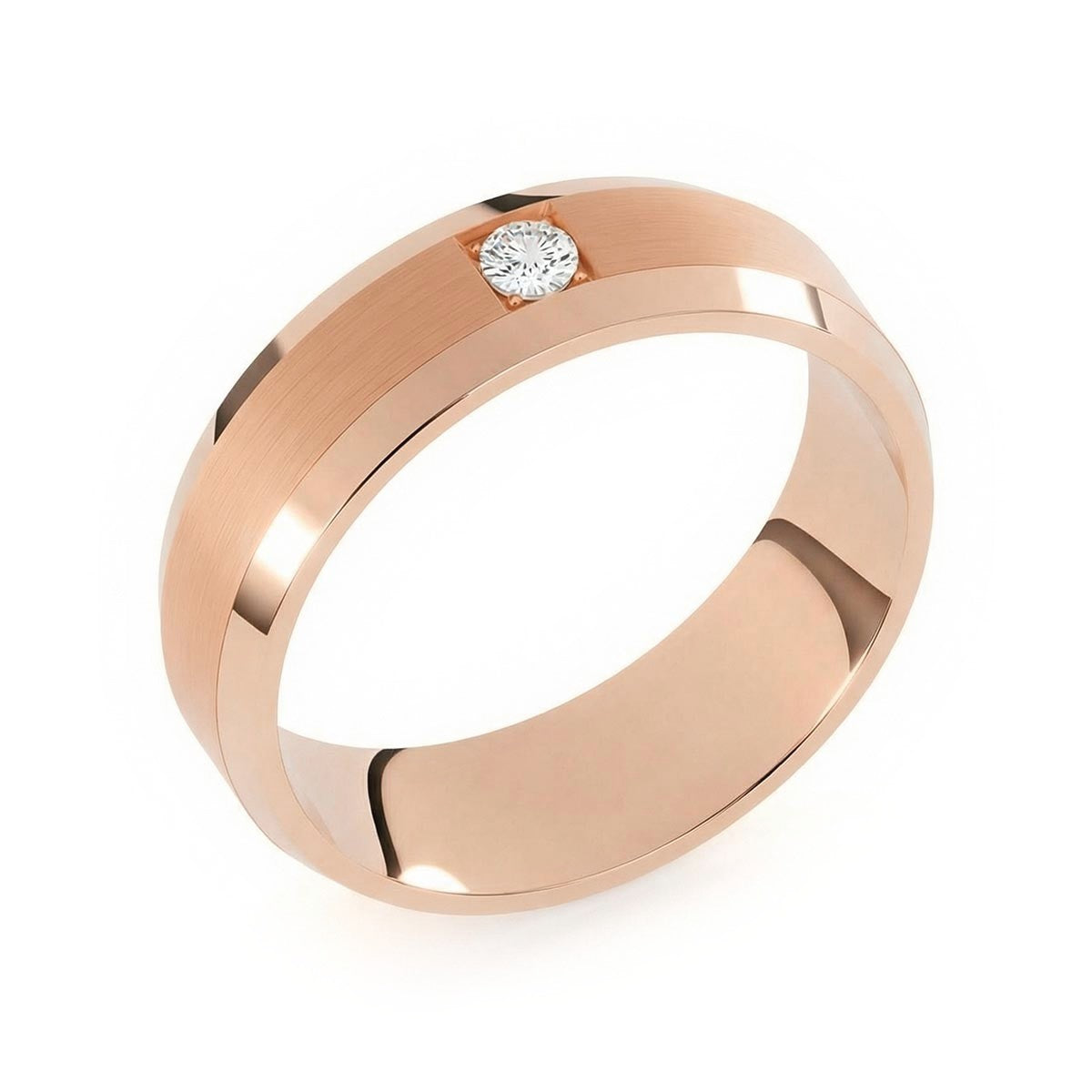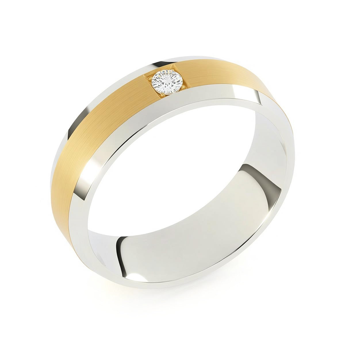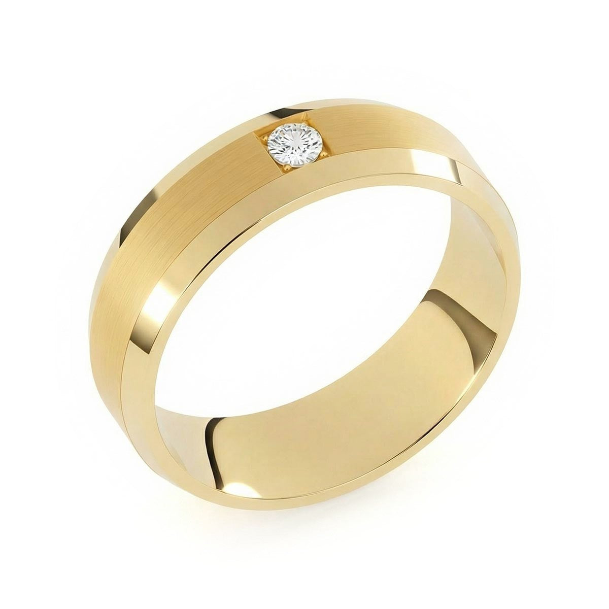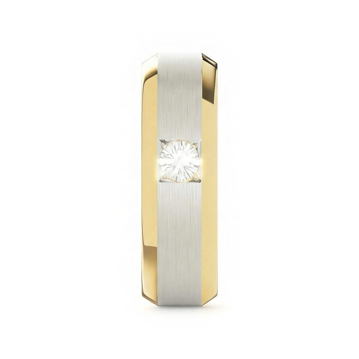 Elevate your commitment with this exquisite 6mm men's wedding ring, a masterpiece of modern luxury. This band features a striking satin inlay center, beautifully framed by polished beveled edges that capture the light from every angle. At its heart sits a brilliant solitaire diamond, offering a touch of refined brilliance. Designed with a premium comfort fit interior, this ring ensures a seamless feel for daily wear. This timeless piece blends masculine strength with sophisticated elegance, making it the perfect symbol of your forever.