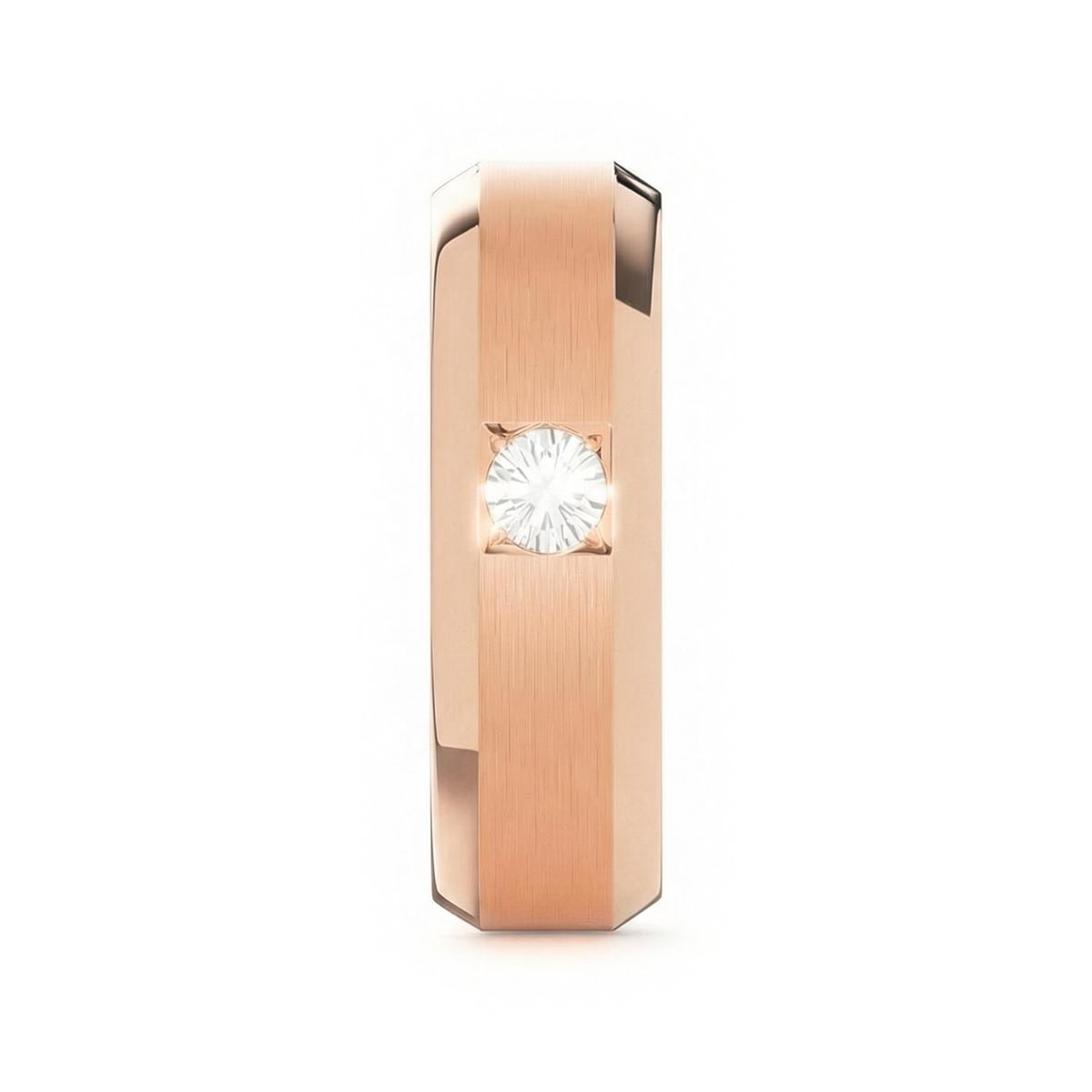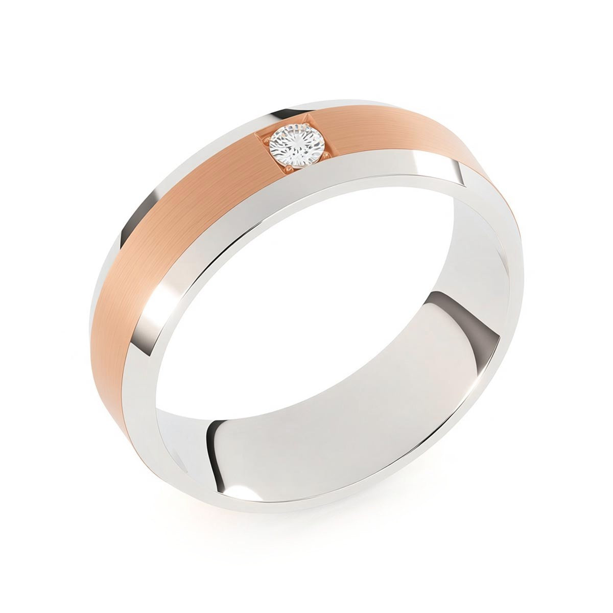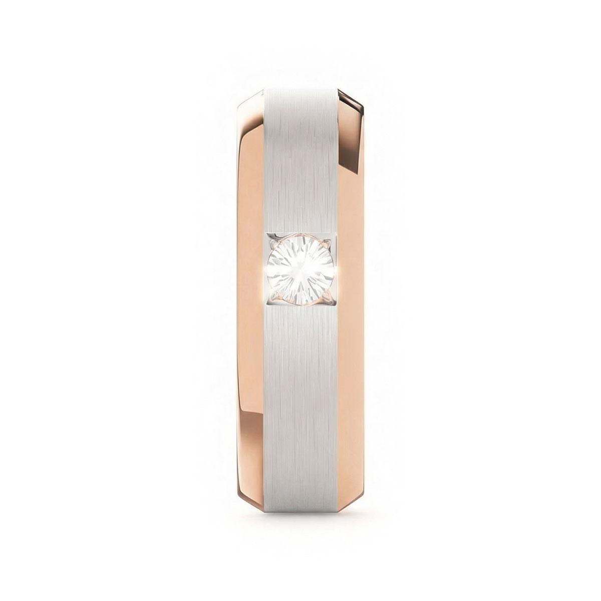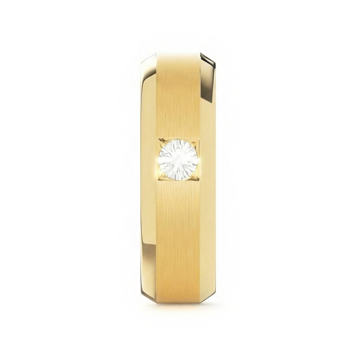 Elevate your commitment with this exquisite 6mm men's wedding ring, a masterpiece of modern luxury. This band features a striking satin inlay center, beautifully framed by polished beveled edges that capture the light from every angle. At its heart sits a brilliant solitaire diamond, offering a touch of refined brilliance. Designed with a premium comfort fit interior, this ring ensures a seamless feel for daily wear. This timeless piece blends masculine strength with sophisticated elegance, making it the perfect symbol of your forever.