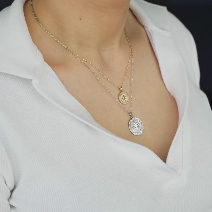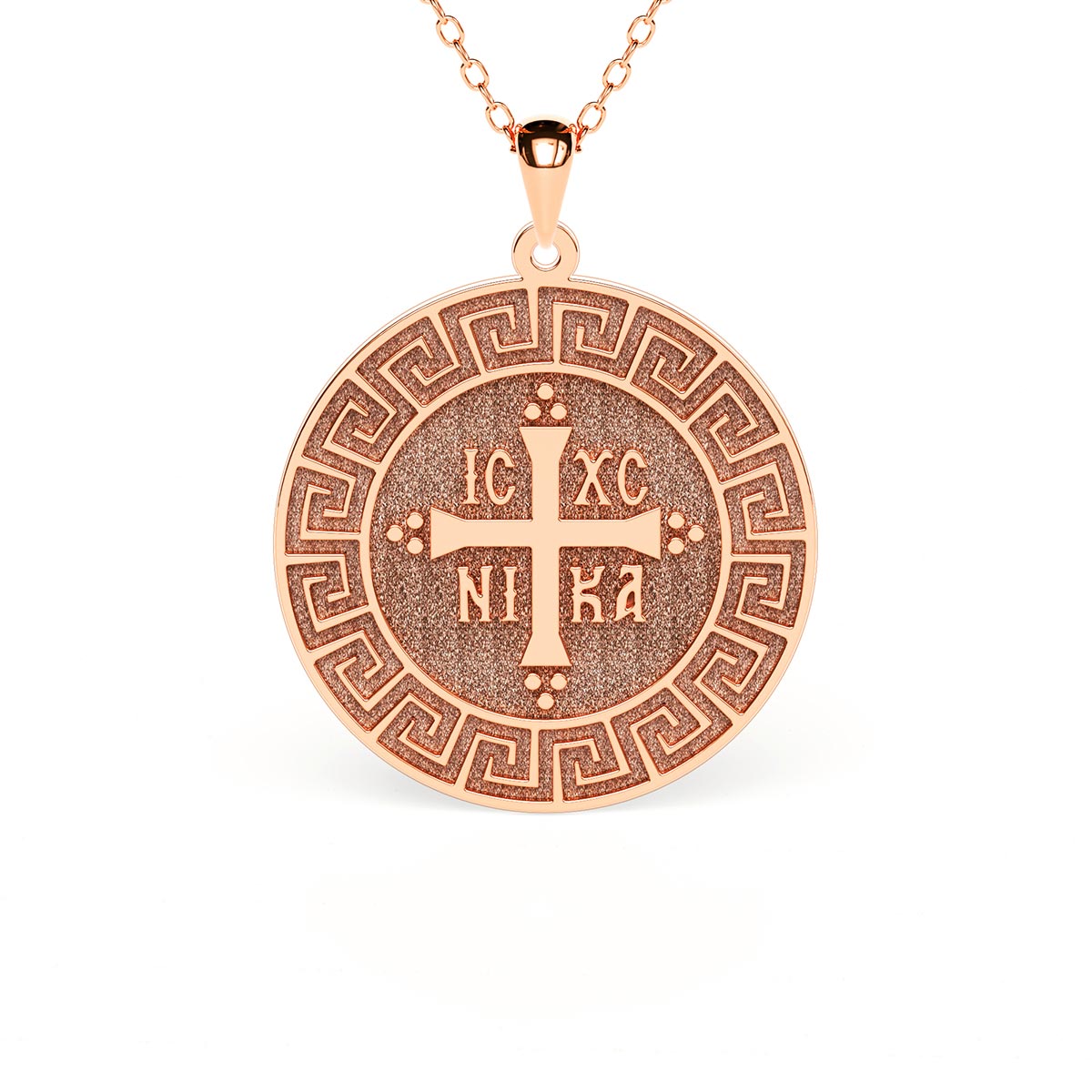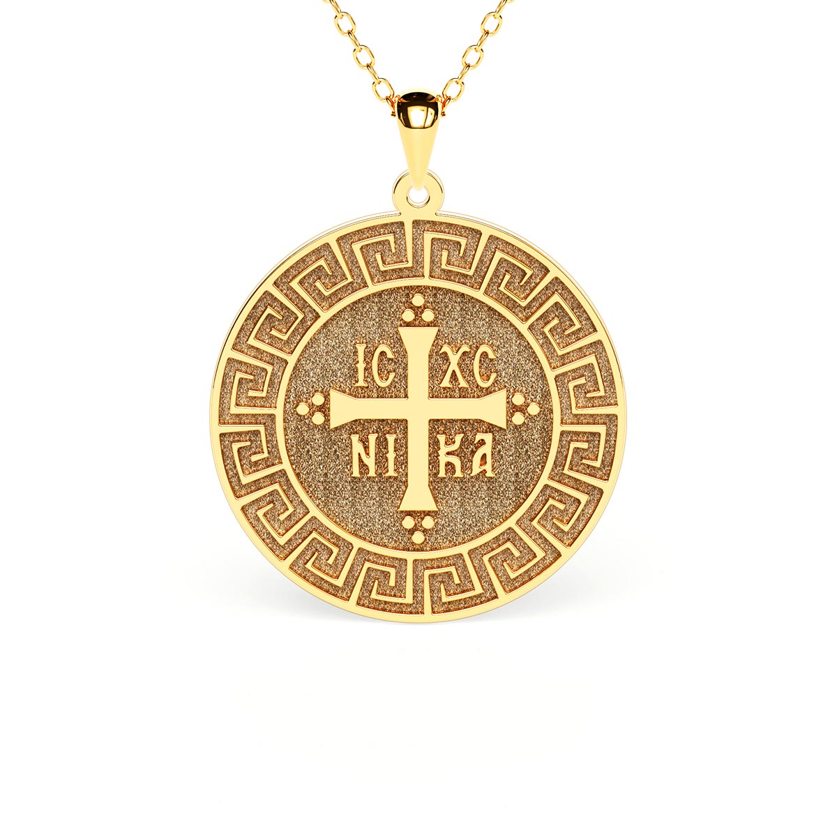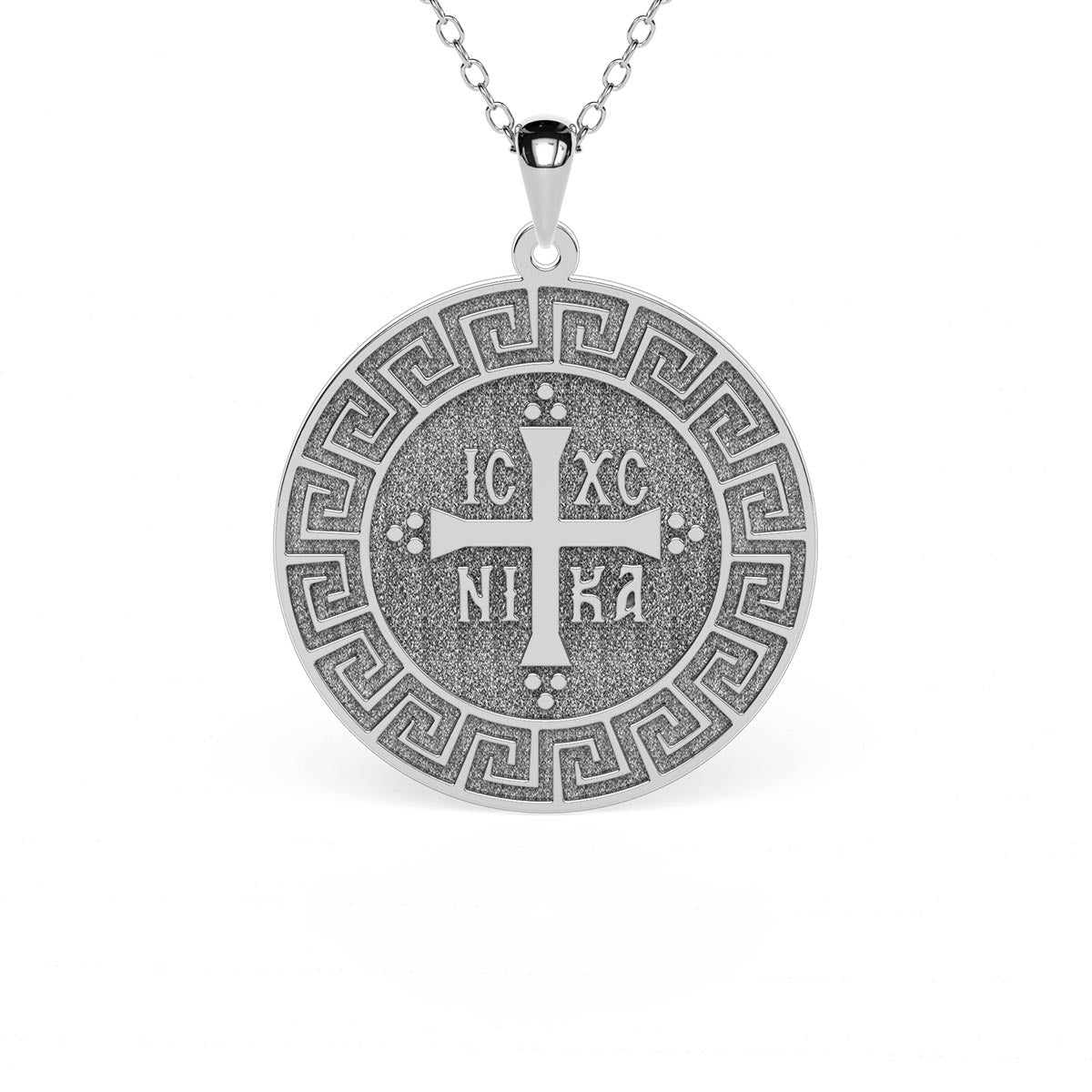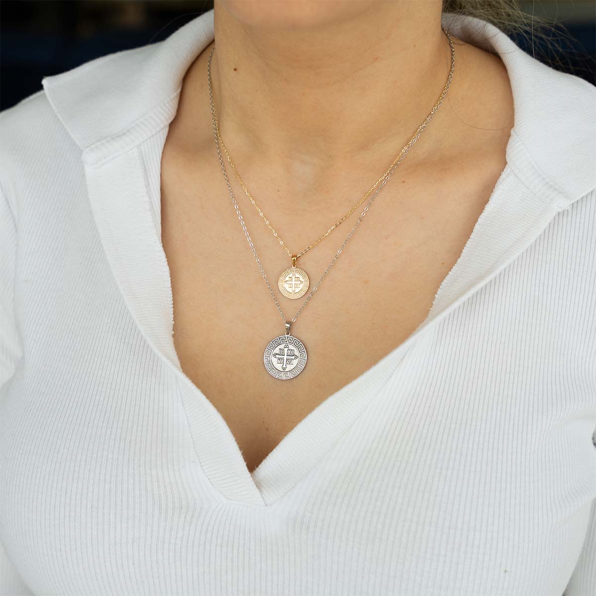 If you're looking for a new cross to add to your jewelry collection, look no further than the Greek key cross disc necklace. This circular pendant is decorated with a cross in the middle and four sets of Greek letters, which represent the phrase, "Jesus Christ Conquers." Greek key etching around the edges completes the understated design, which is available in both standard and mini sizes.