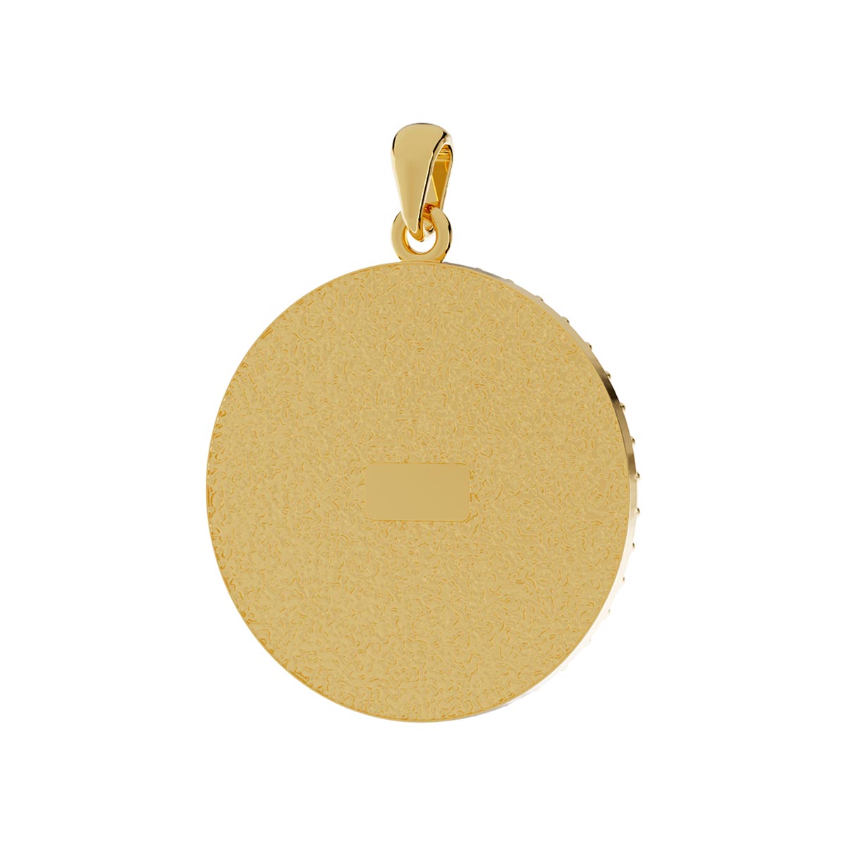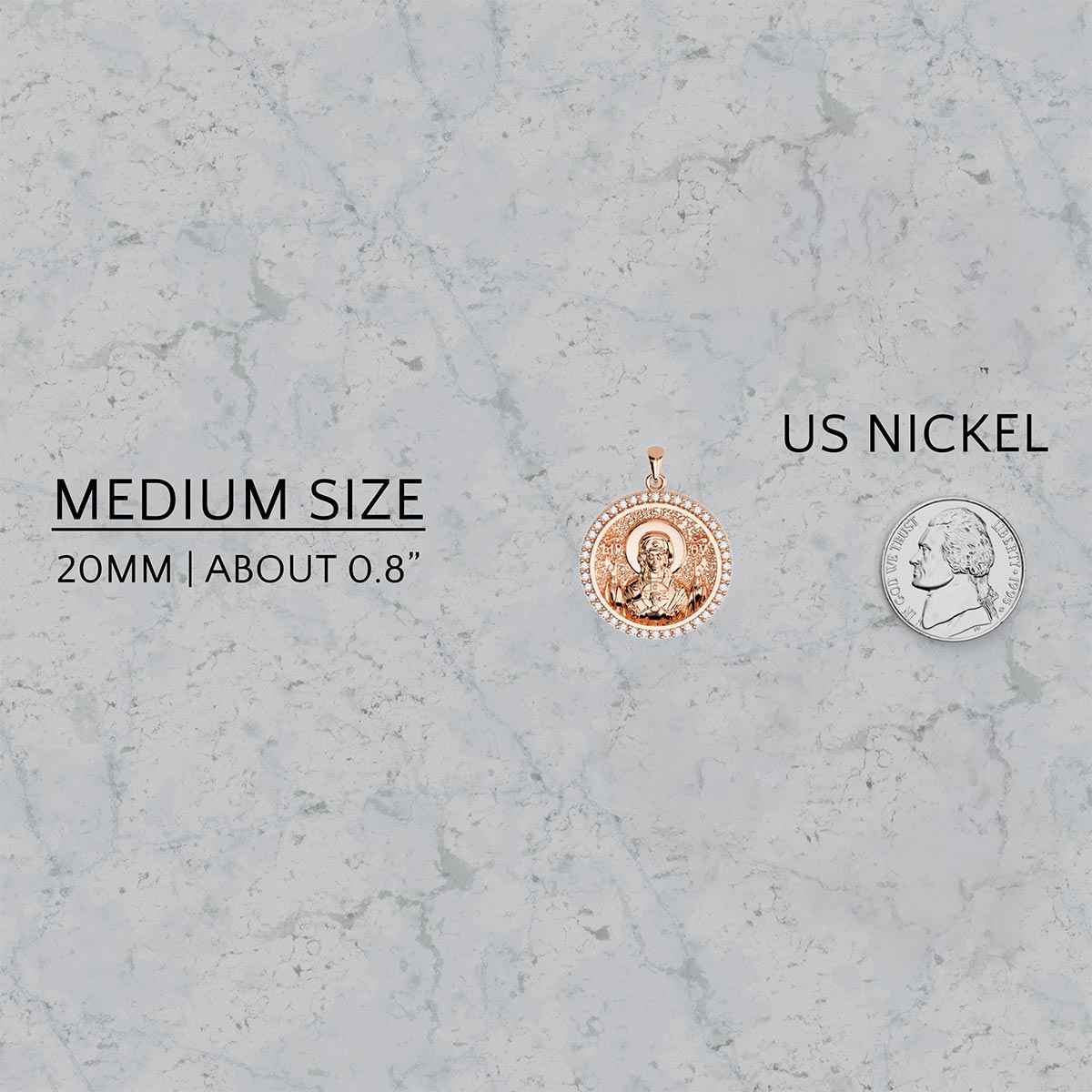 Elegantly crafted, our medium round pavé medal showcases a radiant depiction of the Our Lady of the Sign (Panagia Platytera) Orthodox Icon. This exquisite piece captures the divine grace of the Theotokos in a beautifully sculpted, shimmering pavé setting. Perfect for adorning your favorite chain, this luxurious medal serves as a profound symbol of faith and a treasured keepsake. Experience the enduring beauty and spiritual significance of this uniquely designed devotional item, a testament to artisanal excellence.