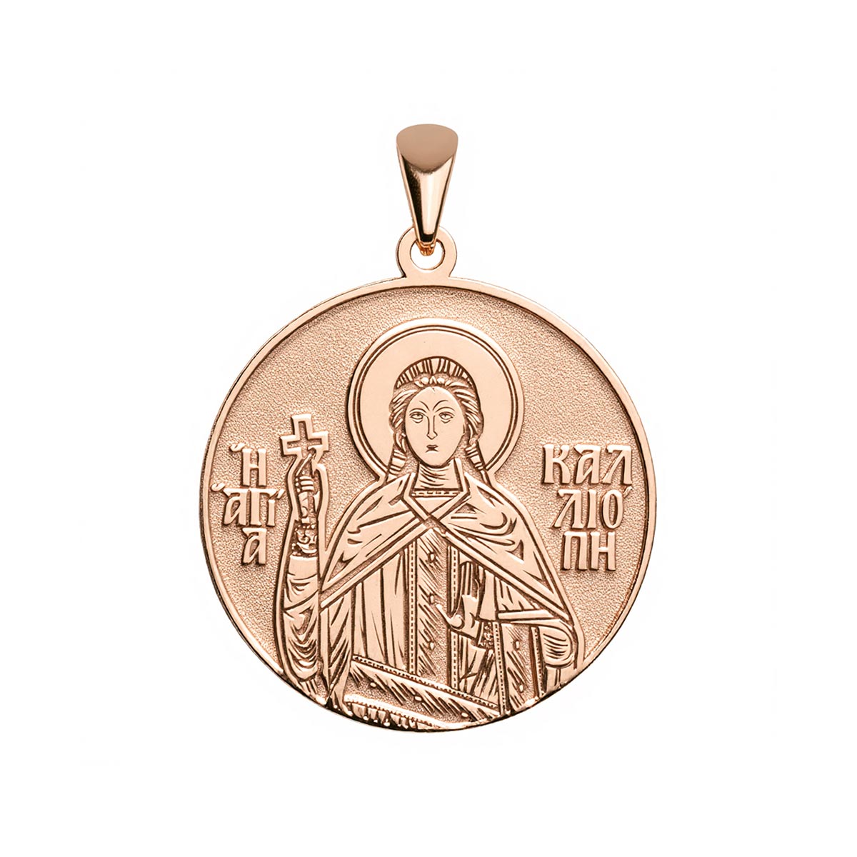 This highly detailed, historically accurate representation of the Greek Orthodox icon of Saint Calliope (Kalliopi) is engraved into a round medal in the metal of your choice. Available with or without a chain, this piece makes for the perfect gift for yourself, or for a special someone’s name day! Saint Calliope was a Christian martyr who was martyred during the reign of the Roman Emperor Diocletian in the 3rd century. She was tortured and martyred for her refusal to renounce her faith. She is venerated as a saint in the Eastern Orthodox Church.
