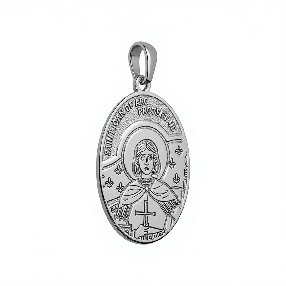 The Saint Joan of Arc Oval Religious Medal is an elegant piece of jewelry available in solid gold or sterling silver. It showcases the image of Saint Joan of Arc, the patroness of soldiers and France, with the words "Saint Joan of Arc Pray For Us" elegantly carved into an oval medal. This religious medal is perfect for individuals who admire Saint Joan's bravery and wish to carry a symbol of determination and faith. With its intricate details and flawless finishing, this medal is a timeless and inspiring accessory meant to uplift and empower the wearer.