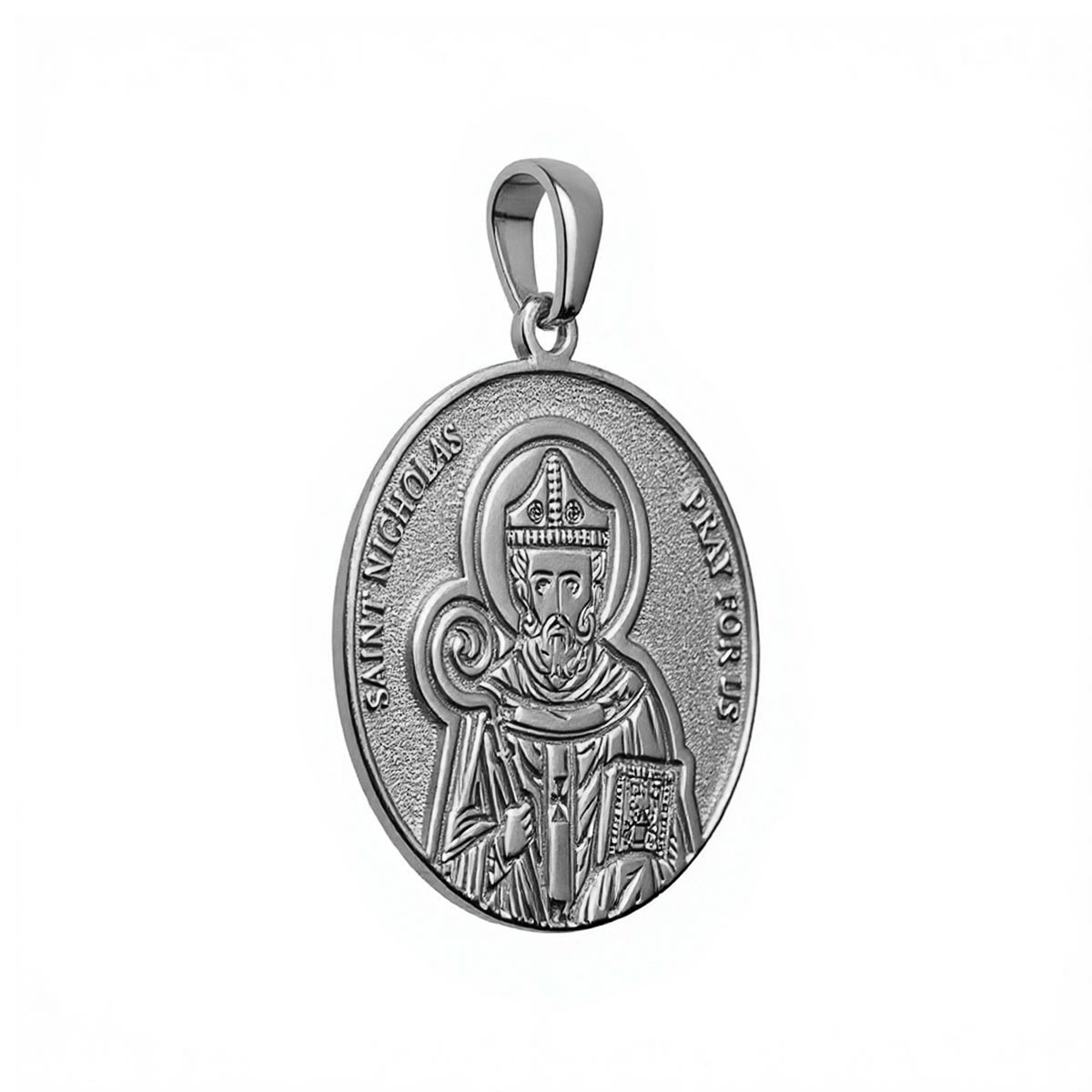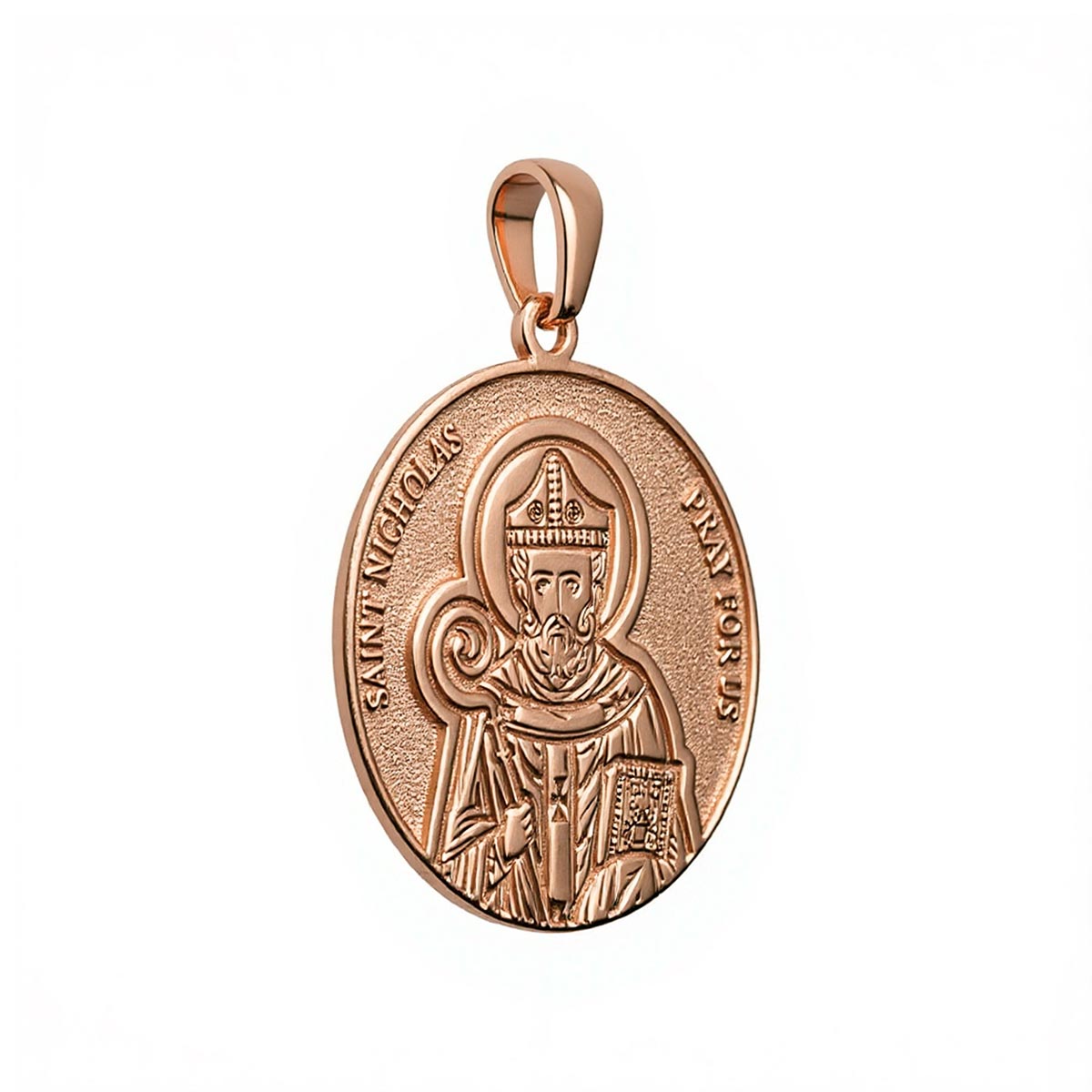 The Saint Nicholas Round Religious Medal is a magnificent piece of jewelry available in solid gold or sterling silver. It features the image of Saint Nicholas, the patron saint of children and sailors, with the words "Saint Nicholas Pray For Us" delicately carved into a round medal. This religious medal is perfect for those who appreciate Saint Nicholas' generosity and wish to carry a symbol of protection and benevolence. With its intricate details and impeccable finishing, this medal is a timeless and inspiring accessory meant to uplift and empower the wearer.