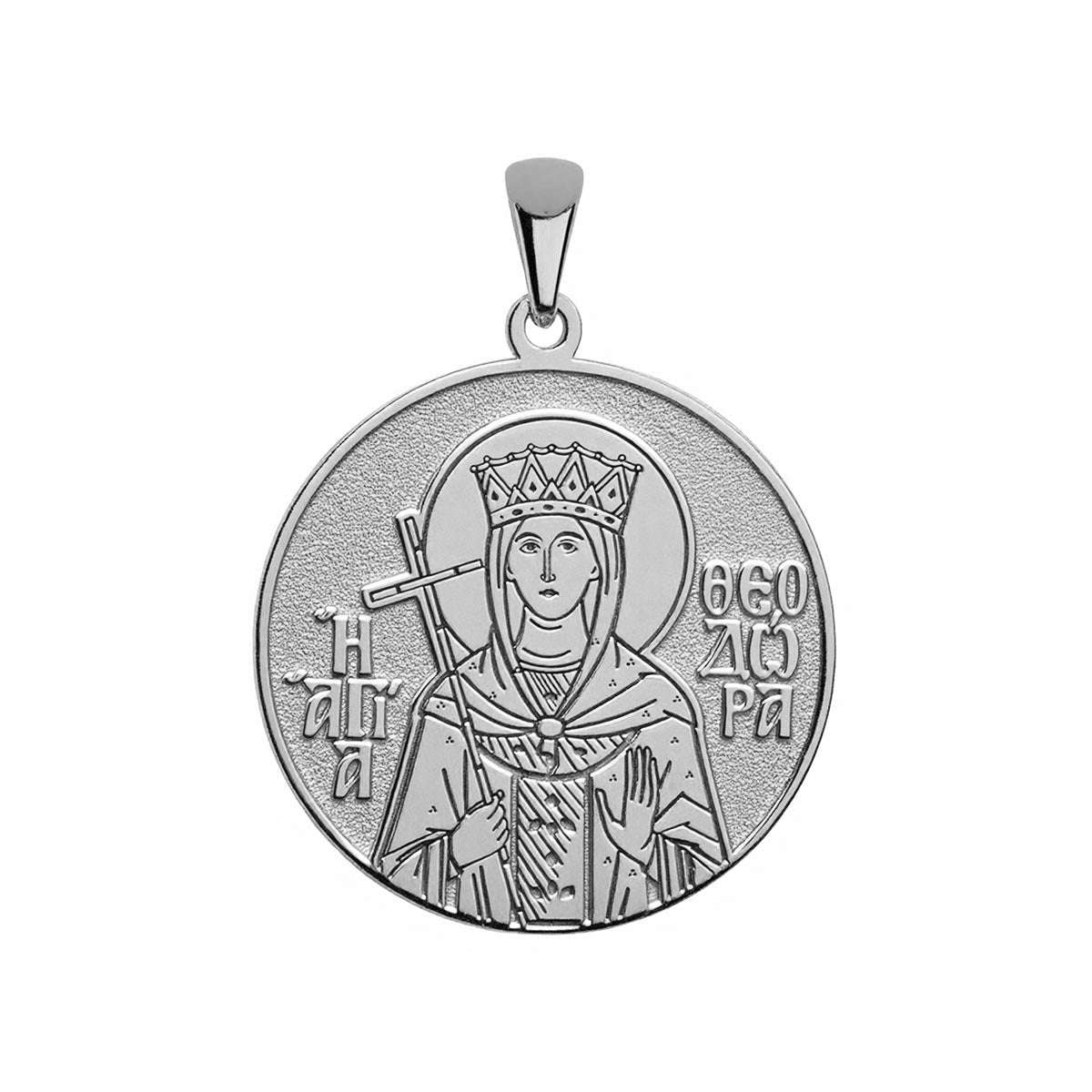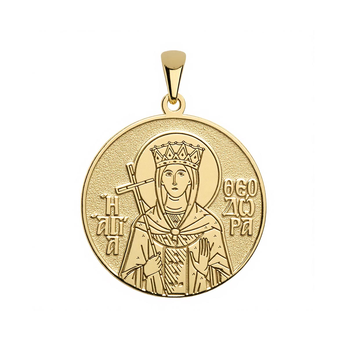 This highly detailed, historically accurate representation of the Greek Orthodox icon of Saint Theodora the Empress is engraved into a round medal in the metal of your choice. Available with or without a chain, this piece makes for the perfect gift for yourself, or for a special someone’s name day! Saint Theodora the Empress was the wife of the Byzantine Emperor Theophilus in the 9th century. She is known for her piety and her efforts to promote the veneration of icons, which were under attack by the Iconoclasts. She is venerated as a saint in the Eastern Orthodox Church.