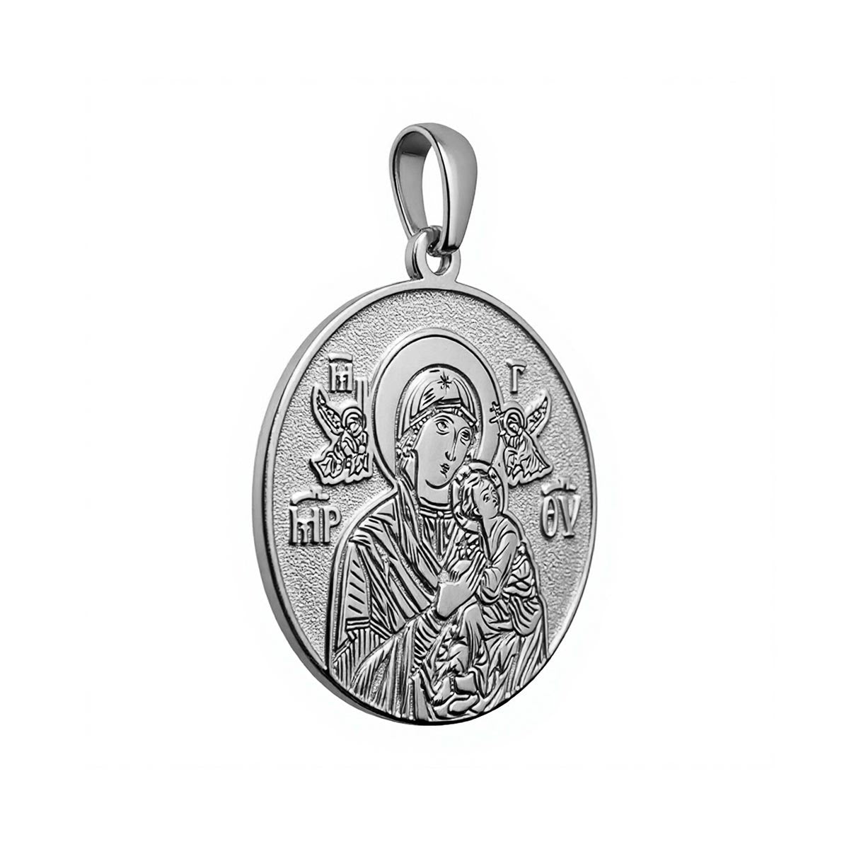 This highly detailed, historically accurate representation of the Greek Orthodox icon of Virgin Mary Theotokos With Angels is engraved into a round medal in the metal of your choice. Available with or without a chain, this piece makes for the perfect gift for yourself, or for a special someone’s name day! This icon depicts the Virgin Mary holding the infant Jesus while surrounded archangels Michael and Gabriel. It symbolizes Mary's role as the Mother of God and emphasizes her intercessory power.