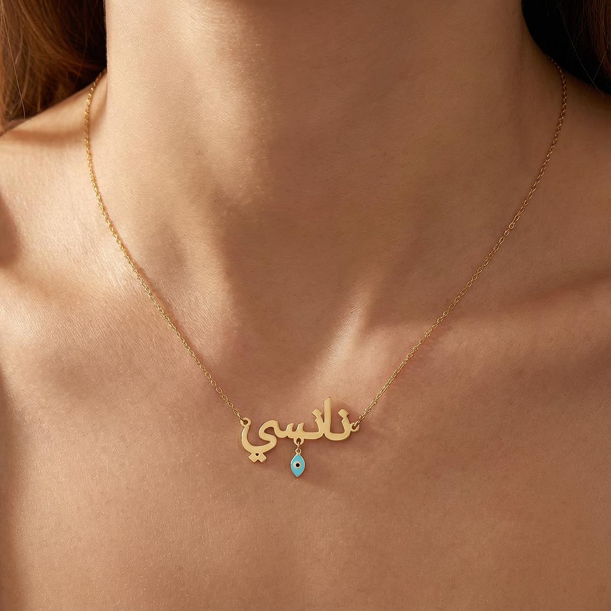 Add a touch of elegance and protection to your jewelry collection with our Arabic Personalized Name Necklace With Hanging Round Evil Eye Charm. This beautiful necklace features your name written in Arabic script, with a stunning round evil eye charm hanging delicately from the name. Available in solid gold or sterling silver, this necklace is the perfect way to showcase your unique style while also protecting yourself from negative energy.