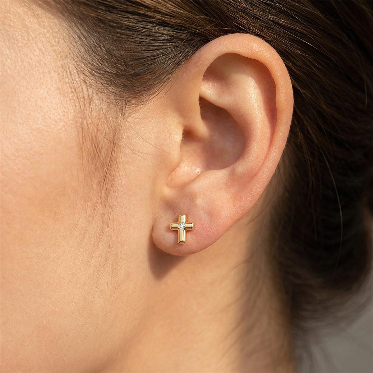 Elevate your jewelry collection with these exquisite Cross Solo Diamond Stud Earrings. Crafted with meticulous attention to detail, each earring features a graceful cross silhouette illuminated by a single, brilliant diamond at its center. These timeless studs offer a touch of understated luxury, perfect for everyday wear or a special occasion. Experience the enduring beauty and subtle sparkle that will become a cherished addition to your ensemble. Discover refined elegance and personal symbolism with these captivating diamond cross earrings.