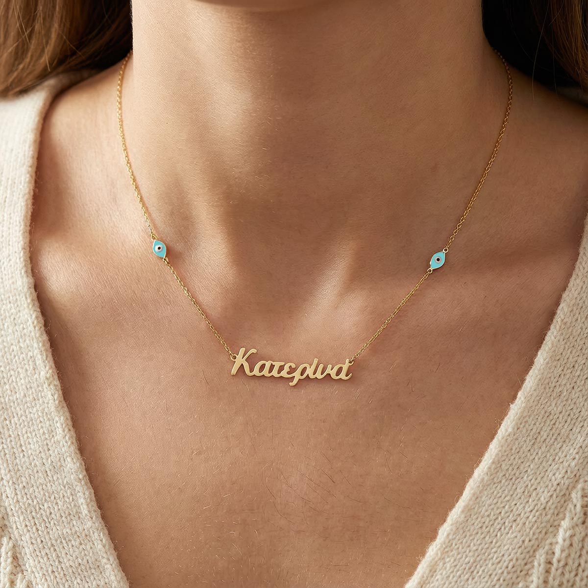 Customize your look with this Greek personalized name necklace featuring evil eye and cross charms. Each necklace is crafted with care, allowing you to showcase your name alongside meaningful symbols. The evil eye charm offers protection, while the cross charm represents faith. This unique and stylish accessory is perfect for expressing your personal style and beliefs, making it a thoughtful and elegant addition to any jewelry collection.