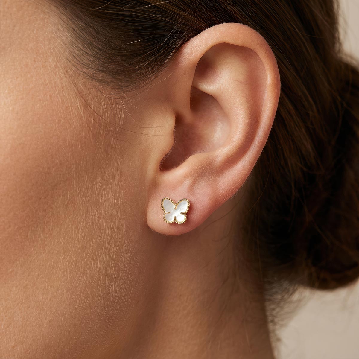 Adorn yourself with the enchanting charm of these Mother of Pearl Butterfly Stud Earrings. Each exquisite piece features delicate butterfly wings crafted from luminous mother of pearl, set within a lustrous gold-tone frame. The intricate beaded detailing adds a touch of timeless elegance, making these earrings a perfect symbol of grace and transformation. Lightweight and comfortable for everyday wear, they bring a subtle, sophisticated sparkle to any outfit. Discover a touch of natural beauty and elevate your jewelry collection with these captivating butterfly studs.