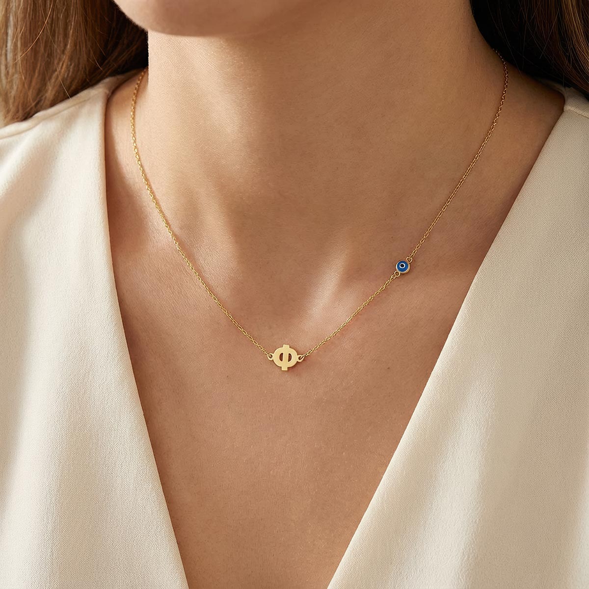 Greek Personalized Initial Necklace With Round Evil Eye Charm