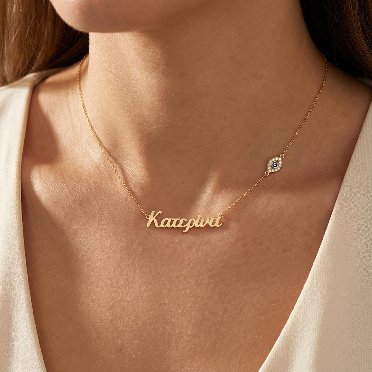 Greek Personalized Name Necklace With Marquise Evil Eye Pavé Charm