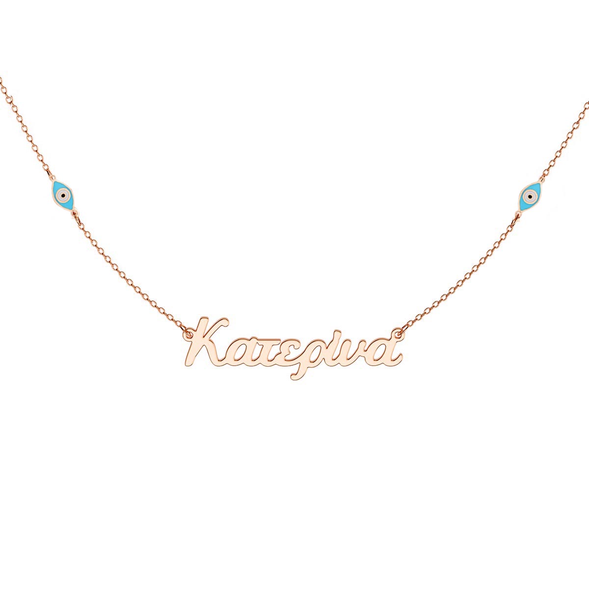 Customize your look with this Greek personalized name necklace featuring evil eye and cross charms. Each necklace is crafted with care, allowing you to showcase your name alongside meaningful symbols. The evil eye charm offers protection, while the cross charm represents faith. This unique and stylish accessory is perfect for expressing your personal style and beliefs, making it a thoughtful and elegant addition to any jewelry collection.