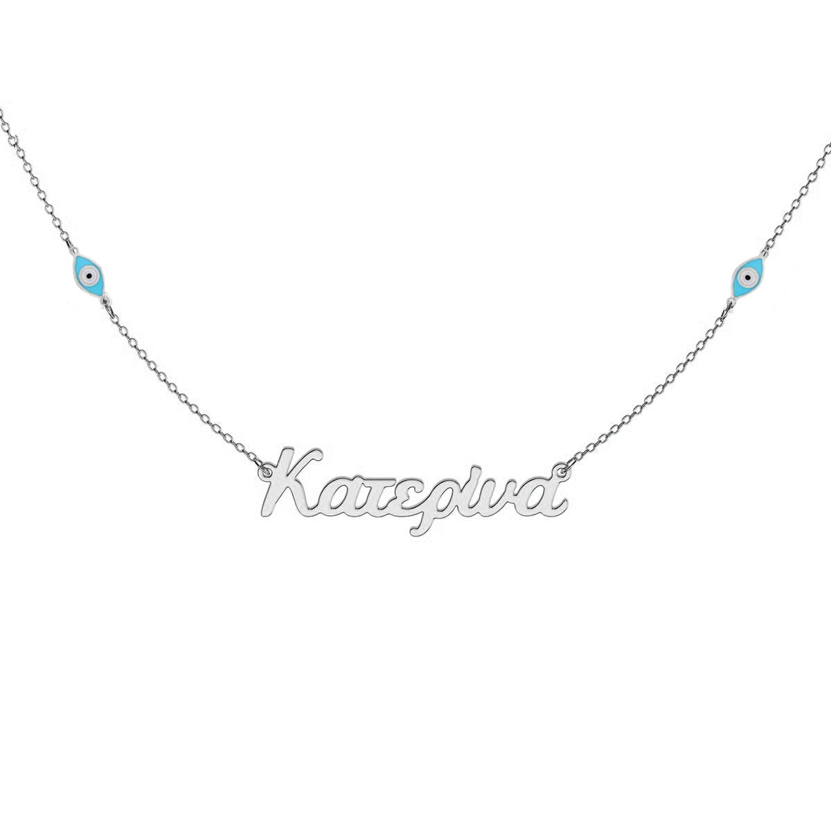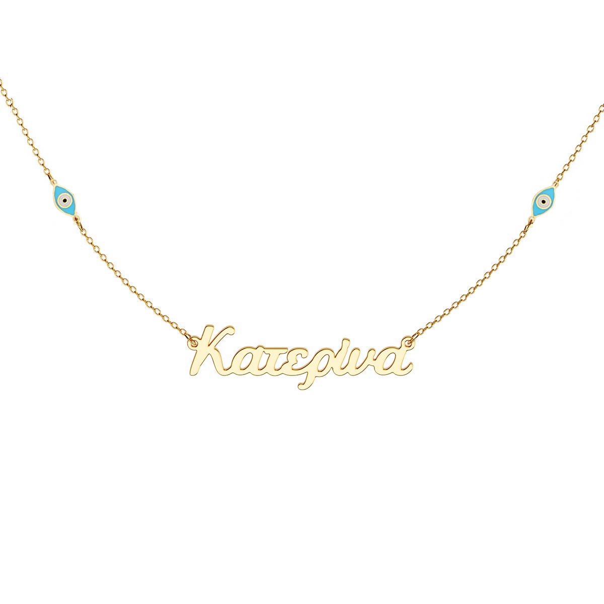 Greek Personalized Name Necklace With Turquoise Evil Eye and Cross Charms