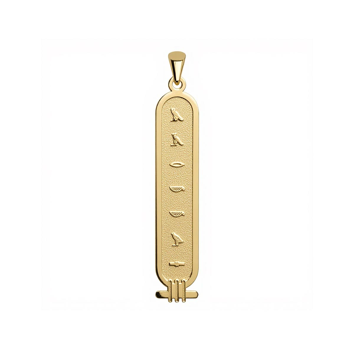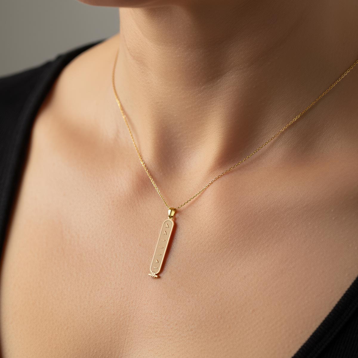 Embrace timeless elegance with our Mini Personalized Cartouche Egyptian Hieroglyph Name Necklace. Crafted with exquisite detail, this luxurious pendant allows you to immortalize your name or a loved one's in authentic ancient Egyptian hieroglyphs. Each miniature cartouche is a bespoke treasure, meticulously hand-engraved to tell your unique story. Wear a piece of history and make a statement of personalized sophistication. This exquisite necklace is the perfect gift for those who cherish individuality and the allure of the ancient world.