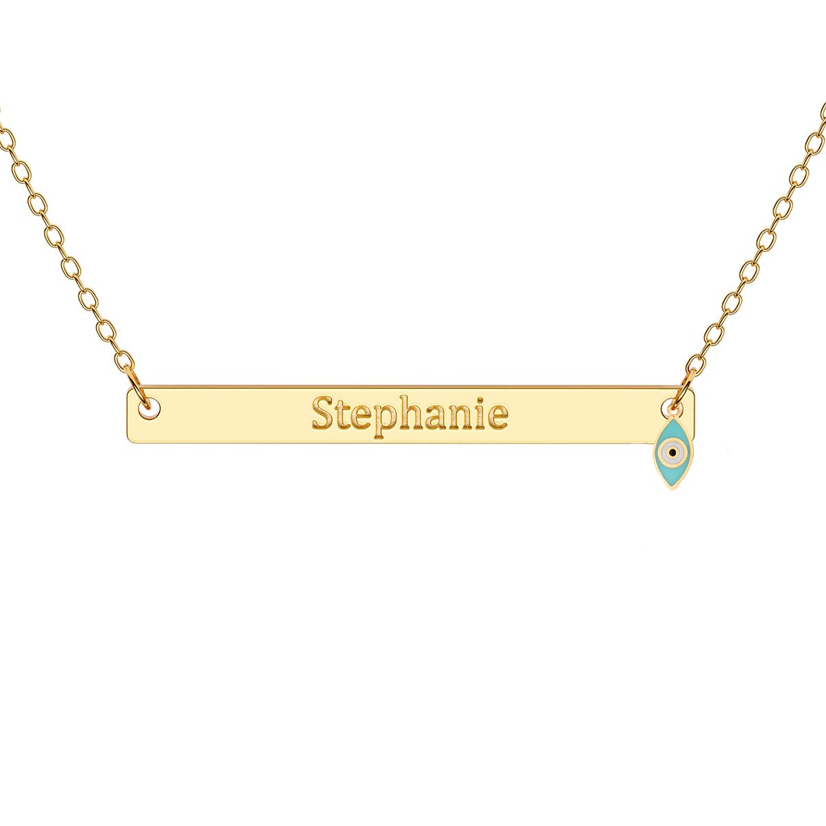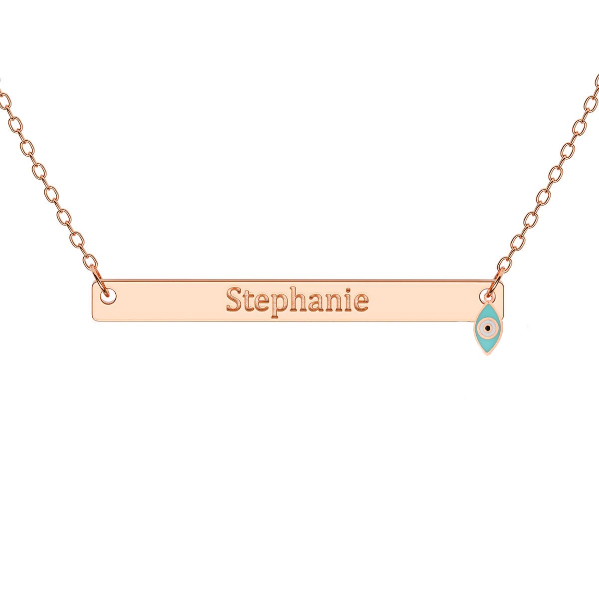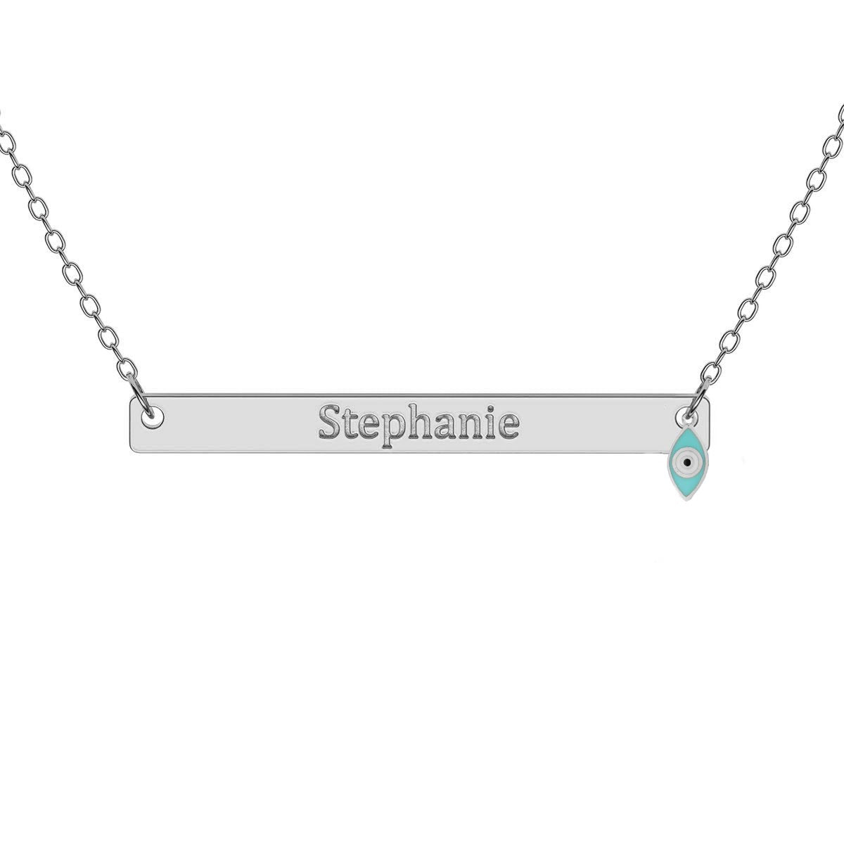 Narrow Horizontal Bar Necklace with Engraving and Turquoise Evil Eye Charm