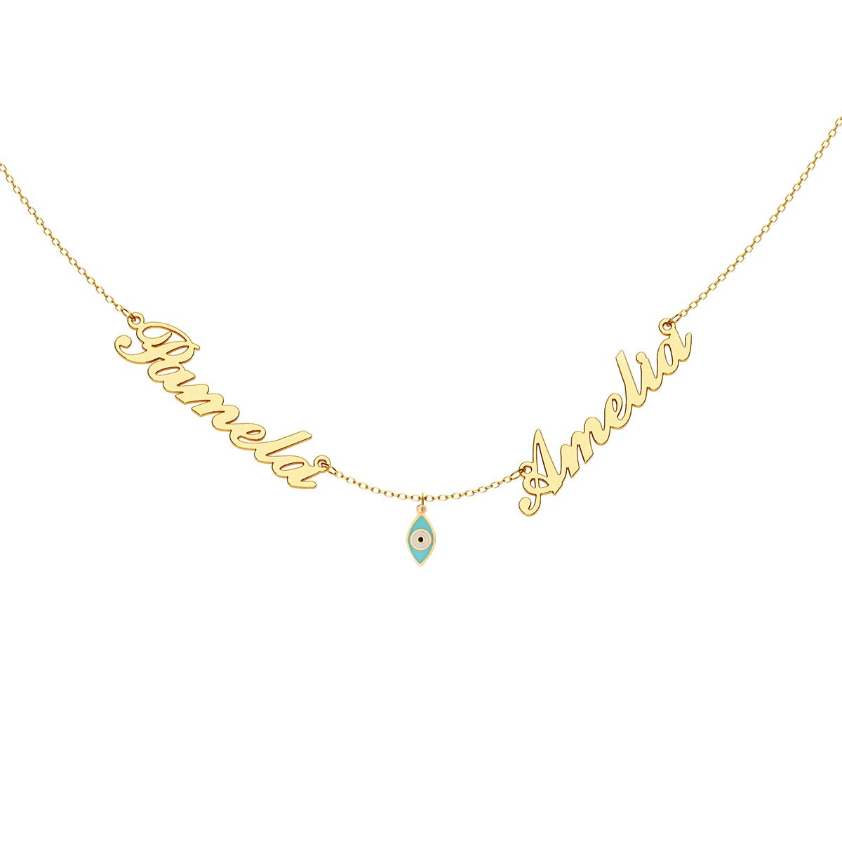 Personalized 2 Name Necklace With Turquoise Enamel Evil Eye