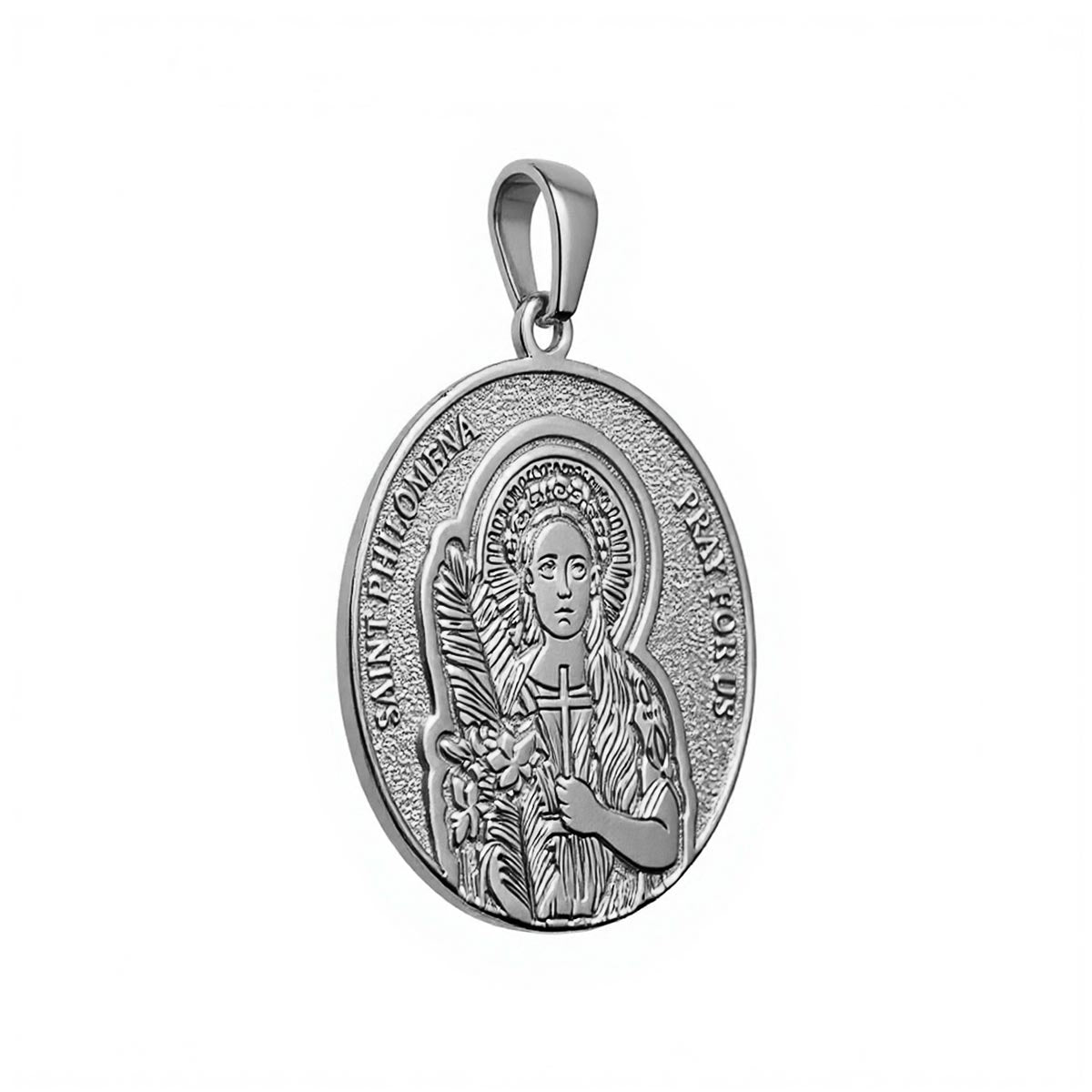 The Saint Philomena Round Religious Medal is a radiant piece of jewelry available in solid gold or sterling silver. It features the image of Saint Philomena, the patroness of youth and purity, with the words "Saint Philomena Pray For Us" delicately carved into a round medal. This religious medal is perfect for those seeking purity and inspiration, carrying a symbol of faith and devotion. With its intricate details and impeccable finishing, this medal is a timeless and inspiring accessory meant to uplift and empower the wearer.